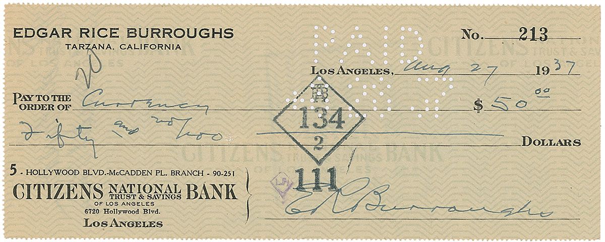 Personal check, 7.75 x 3, filled out and signed by Burroughs, “E. R. Burroughs,” payable to currency for $50, August 27, 1937. In fine condition, with a central vertical fold and expected bank stamps and cancellation holes (stamp touching the top of his first initial).