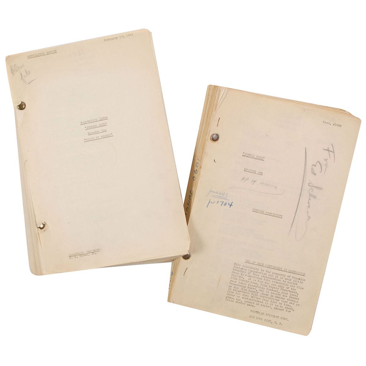 Two original mimeograph brad-bound scripts for the motion picture Jungle Girl, loosely based on the Burroughs novel of the same title, an Estimating Script and a Cutting Continuity Script, both 8.5 x 13, 424 and 309 pages long. The Estimating Script is dated February 17, 1941, and contains episodes one through fifteen, with the first episode 70 pages long, and the other episodes approximately 25 pages each. Both covers have brief pencil notations done in unknown hands. Episode titles from the serial include “Queen of Beasts,” “River of Fire,” “Treasure Tomb,” “Jungle Killer,” and “Diamond Trail.” In fine condition, with front cover of Cutting Continuity script detached, one missing episode from same script, and expected handling wear. Scripts are housed in custom designed green quarter-length boxes. Released in 1941, this classic cliffhanger was quite unusual for the period—it was the first attempt to feature a female lead in an action-orientated movie serial, with Frances Gifford starring as Nyoka, the Jungle Girl.