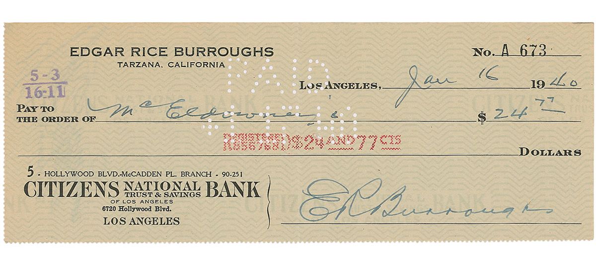 Personal check, 8 x 3, filled out and signed by Burroughs, “E. R. Burroughs,” payable to McEldowney’s for $24.77, January 16, 1940. In fine condition, with a central vertical fold and expected stamps and holes.