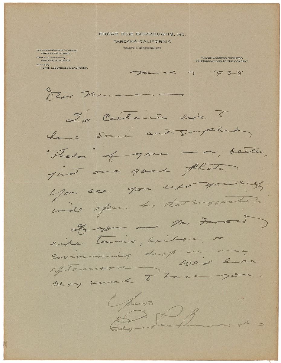 ALS, one page, 8.5 x 11, personal letterhead, March 7, 1938. Letter to actress Maureen O’Sullivan, in full: “I’d certainly like to have some autographed ‘stills’ of you—or, better, just one good photo. You see you left yourself wide open by that suggestion. If you and Mr. farrow like tennis, bridge, or swimming drop in any afternoon. We’d like very much to have you.” Also includes a glossy 10 x 8 full-length photo of O’Sullivan as Jane from the Tarzan series, signed and inscribed in blue ink, “Best wishes, Maureen O’Sullivan.” The letter is in very good to fine condition; the photo is in fine condition. After several years of small parts and studio swapping, O’Sullivan landed her breakthrough role when she was cast as Jane Parker opposite Johnny Weissmuller in 1932’s Tarzan the Ape Man, the first of six Tarzan films she would star in. The film’s success transformed O’Sullivan into a popular leading lady and one of MGM’s most successful ingenues during the 1930s.