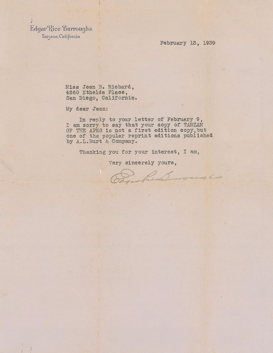 TLS, one page, 8.5 x 11, personal letterhead, February 13, 1939. Letter to Jean B. Richard, in full: “In reply to your letter of February 9, I am sorry to say that your copy of Tarzan of the Apes is not a first edition copy, but one of the popular reprint editions published by A. L. Burt & Company.” In fine condition, with a small hole and splits along intersecting folds.