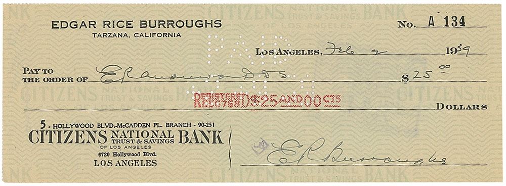 Personal check, 8.5 x 3, filled out and signed by Burroughs, “E. R. Burroughs,” payable to E. R. Andrews DDS for $25, February 2, 1939. In fine condition.