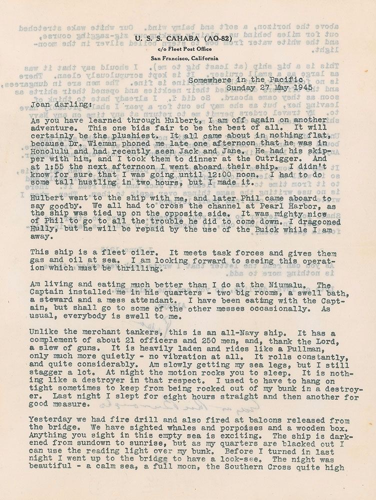 TLS signed “Papa, Edgar Rice Burroughs,” one page both sides, 8 x 10.5, USS Cahaba letterhead, May 27, 1945. Letter to his daughter Joan, from “somewhere in the Pacific,” in part: “It meets task forces and gives them gas and oil at sea. I am looking forward to seeing this operation which must be thrilling. Am living and eating much better than I do at the Niumalu. The Captain installed me in his quarters—two big rooms, a swell bath, a steward and a mess attendant. I have been eating with the Captain, but shall go to some of the other messes occasionally. As usual, everybody is swell to me. Unlike the merchant tankers, this is an all-Navy ship. It has a complement of about 21 officers and 250 men, and, thank the Lord, a slew of guns…Yesterday we had a fire drill and also fired at balloons released from the bridge…The night is beautiful—a calm sea, a full moon, the Southern Cross quite high above the horizon, a soft and balmy wind. Our white wake stretched out for miles behind us, plainly marking our zig-zagging course…This is a big ship…it is kept scrupulously clean. There is no formality, but the discipline is fine. The men are in dungarees, and the officers discarded their neckties and opened their shirts as soon as they came aboard. So did I. I already hate to think of leaving her, but as she may be out for a year I shall probably have to. My travel orders permit me to return at any time on any Navy ship or plane that can take me.” In fine condition, with intersecting folds, one through a single letter of signature.