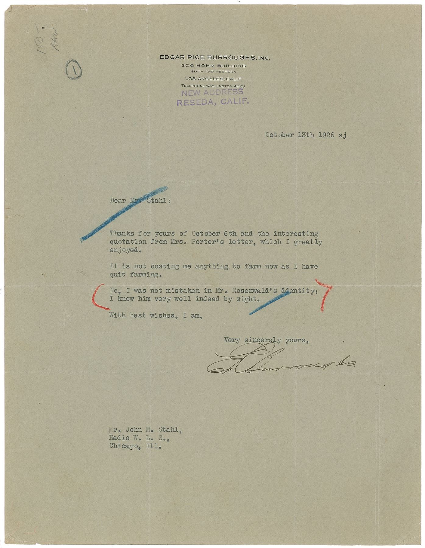 TLS signed “E. R. Burroughs,” one page, 8.5 x 11, personal letterhead, October 13, 1926. Letter to John M. Stahl of Radio W. L. S., in full: "Thanks for yours of October 6th and the interesting quotation from Mrs. Porter's letter, which I greatly enjoyed. It is not costing me anything to farm now as I have quit farming. No, I was not mistaken in Mr. Rosenwald's identity: I knew him very well indeed by sight." In very good to fine condition, with several intersecting folds and scattered light creasing.