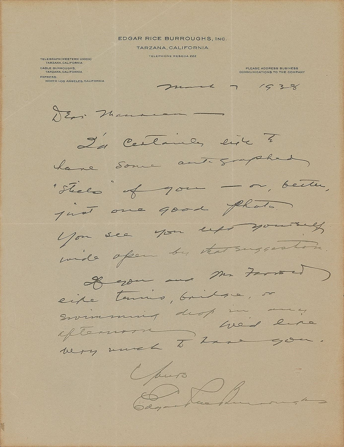 ALS, one page, 8.5 x 11, personal 'Tarzana' letterhead, March 7, 1938. Letter to Tarzan's Jane, the actress Maureen O'Sullivan, in full: "I'd certainly like to have some autographed 'stills' of you—or, better, just one good photo. You see you left yourself wide open by that suggestion. If you and Mr. Farrow like tennis, bridge, or swimming drop in some afternoon. We'd like very much to have you.” Includes a glossy 10 x 8 photo of O'Sullivan as Jane, poised to swing from a tree, signed in blue ink, “Best wishes, Maureen O’Sullivan." In very good to fine condition, with toning, creasing, and a small tear to the bank area above the signature. From the collection of Mia Farrow, Maureen O'Sullivan's daughter.