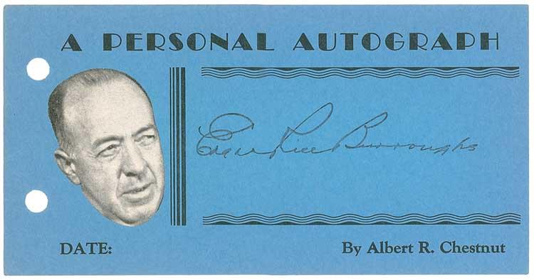 Vintage fountain pen signature, “Edgar Rice Burroughs,” on a 5.5 x 2.75 blue card from the Albert R. Chestnut collection. In fine condition, with a small photo attached to the left blank area. From his Pennsylvania home, Chestnut, a printer by profession, began collecting autographs in 1935. He sent these personally-printed cards to over a thousand celebrities and received favorable replies from the vast majority, finally retiring from collecting to raise his family when postage increased from 2¢ per card! RRAuction COA.