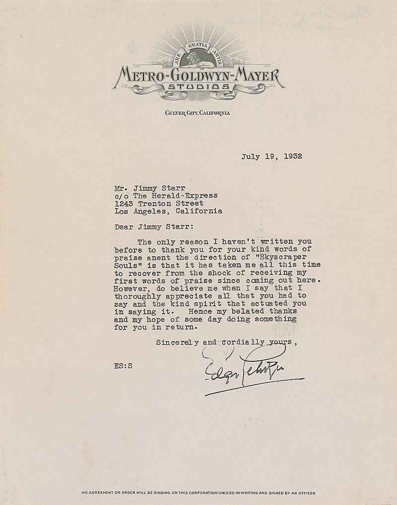 Prominent director (1875–1944) who co-founded Goldwyn Pictures in 1916. TLS, one page, 8.5 x 11, Metro-Goldwyn-Mayer Studios letterhead, July 19, 1932. Letter to columnist Jimmy Starr. In part: “The only reason I haven’t written you before to thank you for your kind words of praise anent the direction of ‘Skyscraper Souls’ is that it has taken me all this time to recover from the shock of receiving my first words of praise since coming out here.” In fine condition, with intersecting folds, one vertical fold passing through a single letter of the signature, and mild scattered creases.
