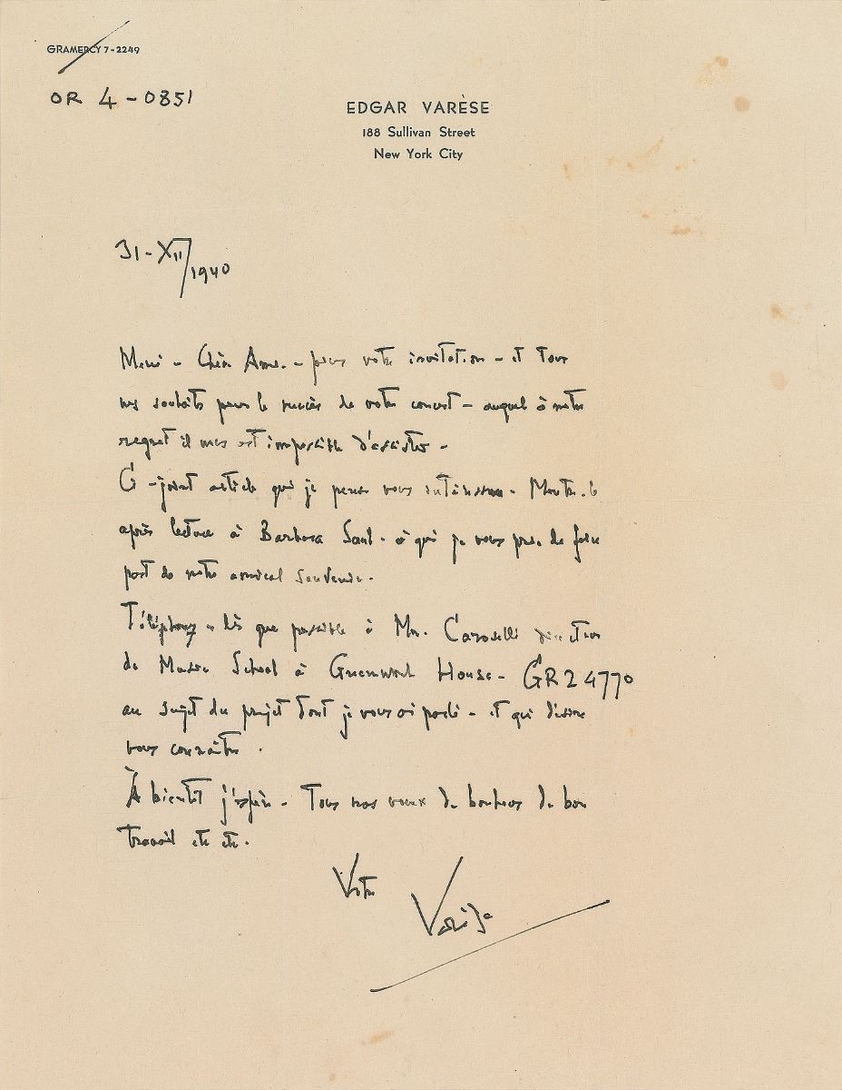 French-born composer (1883–1965) who spent the greater part of his career in the United States. Untranslated ALS in French, signed “Varese,” one page, 8.5 x 11, personal letterhead, July 31, 1940. In fine condition, with some small light stains to upper right. Accompanied by the original mailing envelope, addressed in his own hand.