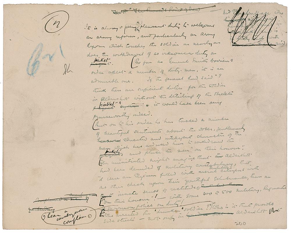 British novelist, playwright, and journalist who produced popular detective and suspense stories and was in his time ‘the king’ of the modern thriller. Partial handwritten manuscript, signed at the conclusion, “Edgar Wallace,” two pages, 10.25 x 8.25, no date. Possibly unpublished manuscript with numerous edits, about the exploits of a soldier. In part: “It is always a very pleasant duty to welcome an army return, and particularly an army return which touches the soldier as nearly as it does the withdraw of so irksome duty as picket... But on his order he has evoked a number of beautiful sentiments about the sober, gentlemanly educated and intelligent character of the men which has induced him to withdraw the pickets and place the men ‘on their honor.’...’On their honour!’—with some 400 to 500 military, regiments, & garrison police on duty! Who arrested the ‘drunken’ soldier? Who is it that prowls side streets, not only in Aldenshot but in London on the look-out for military crime?” Very good with several intersecting folds, even toning, and scattered soiling and foxing. A desirable ‘lost’ work by one of the masters of the written word.