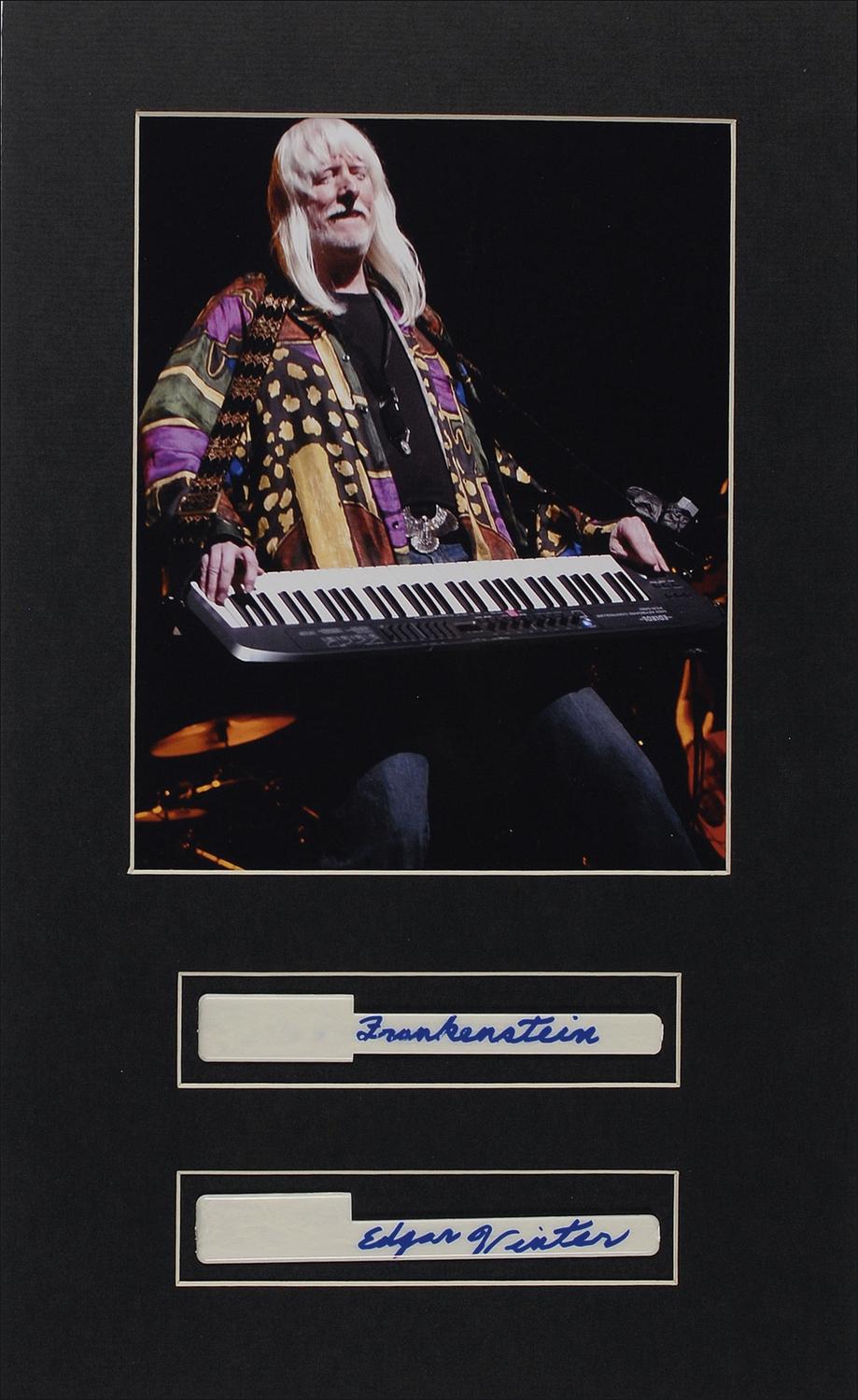 Two white piano keys, one signed in blue felt tip, “Edgar Winter,” the other signed “Frankenstein.” Both are matted with a color photo of Winter playing keyboards to an overall size of 11.25 x 18.25. In fine condition.