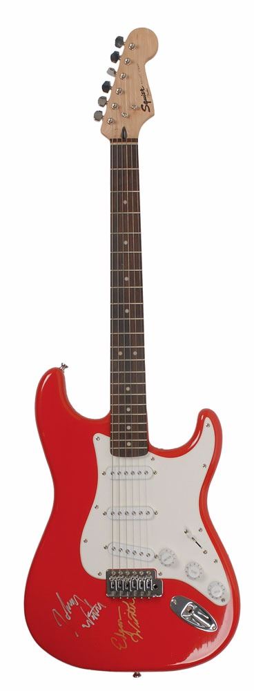 Red-bodied Fender Squier Bullet Strat right-handed electric guitar, signed on the body in silver and gold ink by Edgar and Johnny Winter. In fine condition. Accompanied by a full letter of authenticity from PSA/DNA for the Johnny signature. Pre-certified REAL.