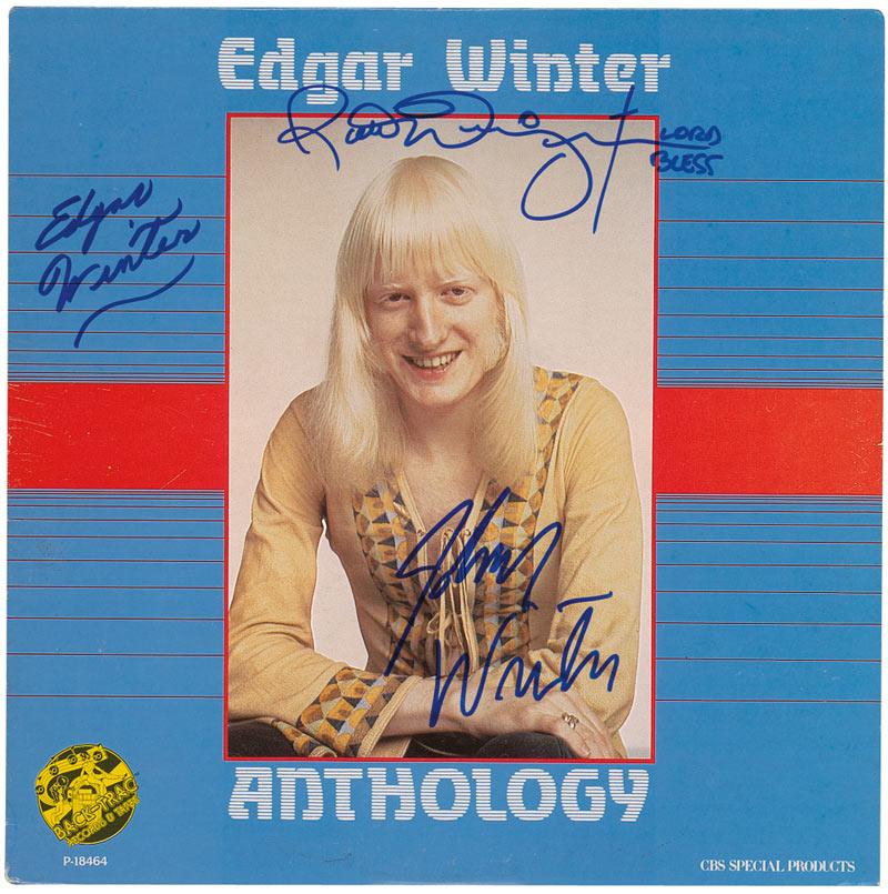 Anthology album signed on the front cover in blue felt tip by Edgar Winter, Johnny Winter, and Rick Derringer. In fine condition, with mild wear and creasing to edges and corners, and a few light scratches to the back cover. The record is included.