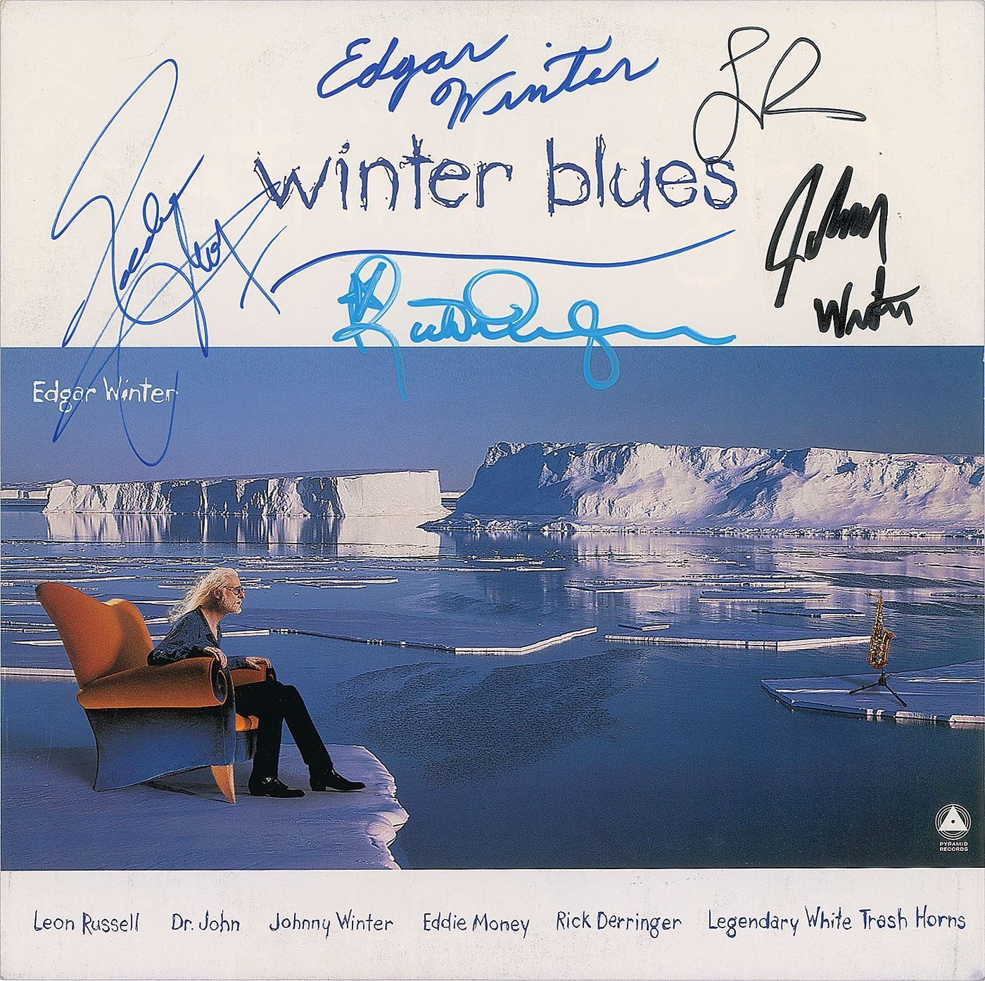 Winter Blues album flat signed on the front cover in various ink types by Edgar Winter, Johnny Winter, Leon Russell, Rick Derringer, and Eddie Money. In fine condition. The record is not included. Consignor notes that the signatures were all obtained in person.