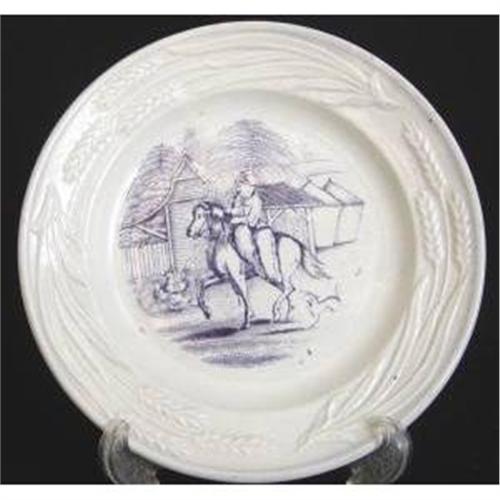 <p> Serpia print of a Woman riding side saddle through a farm yard. Border has moulded sprigs of wheat.