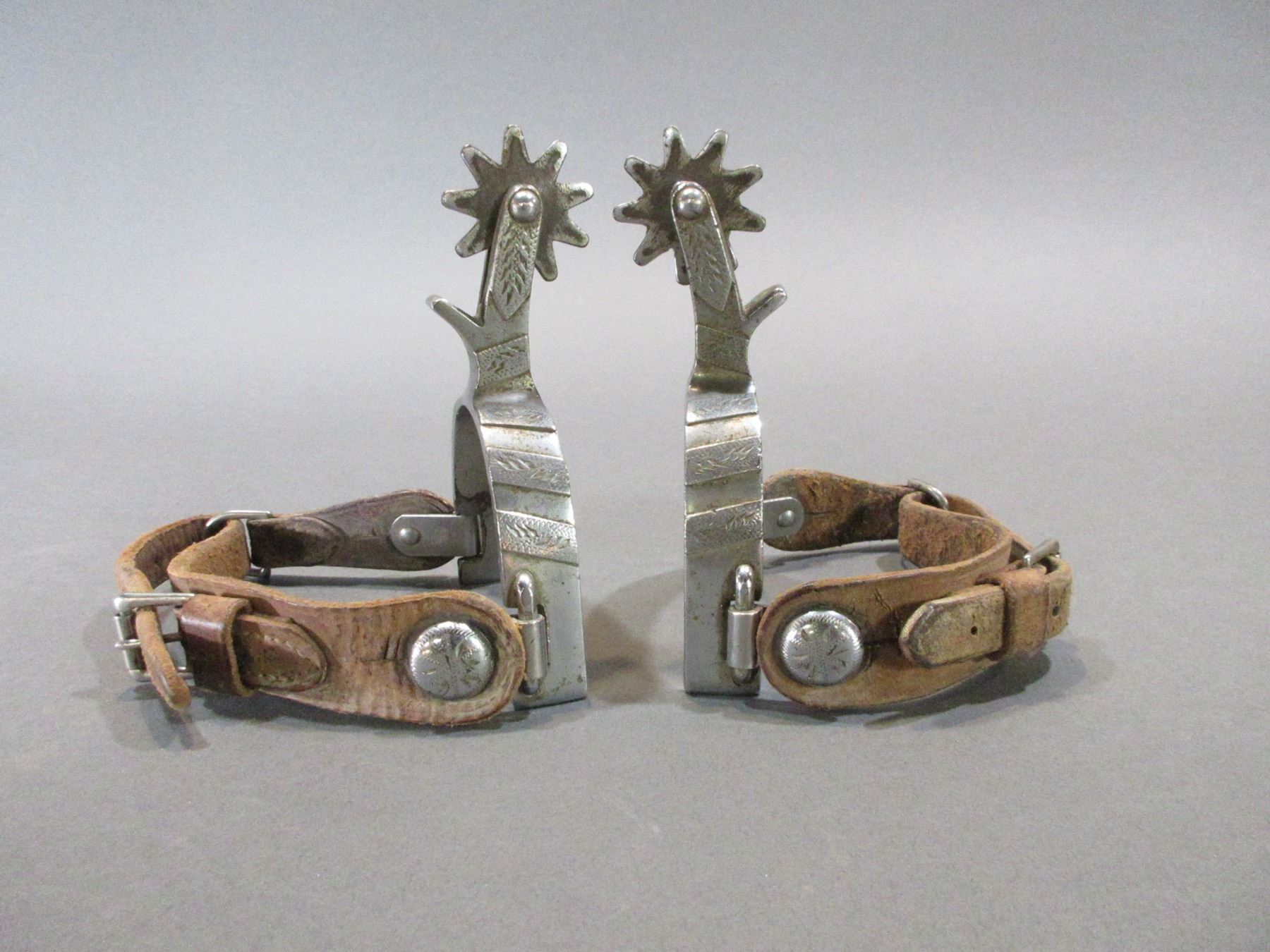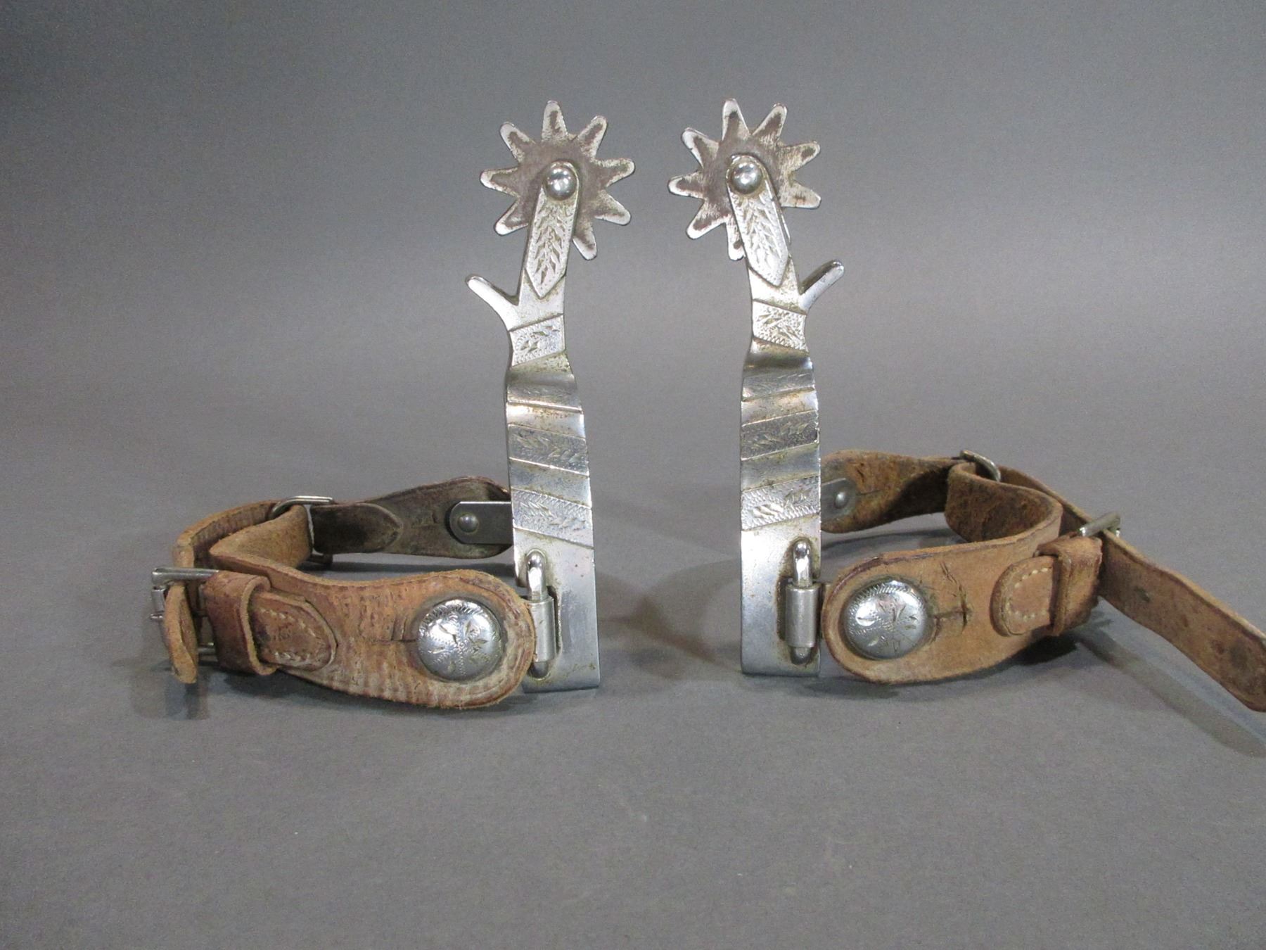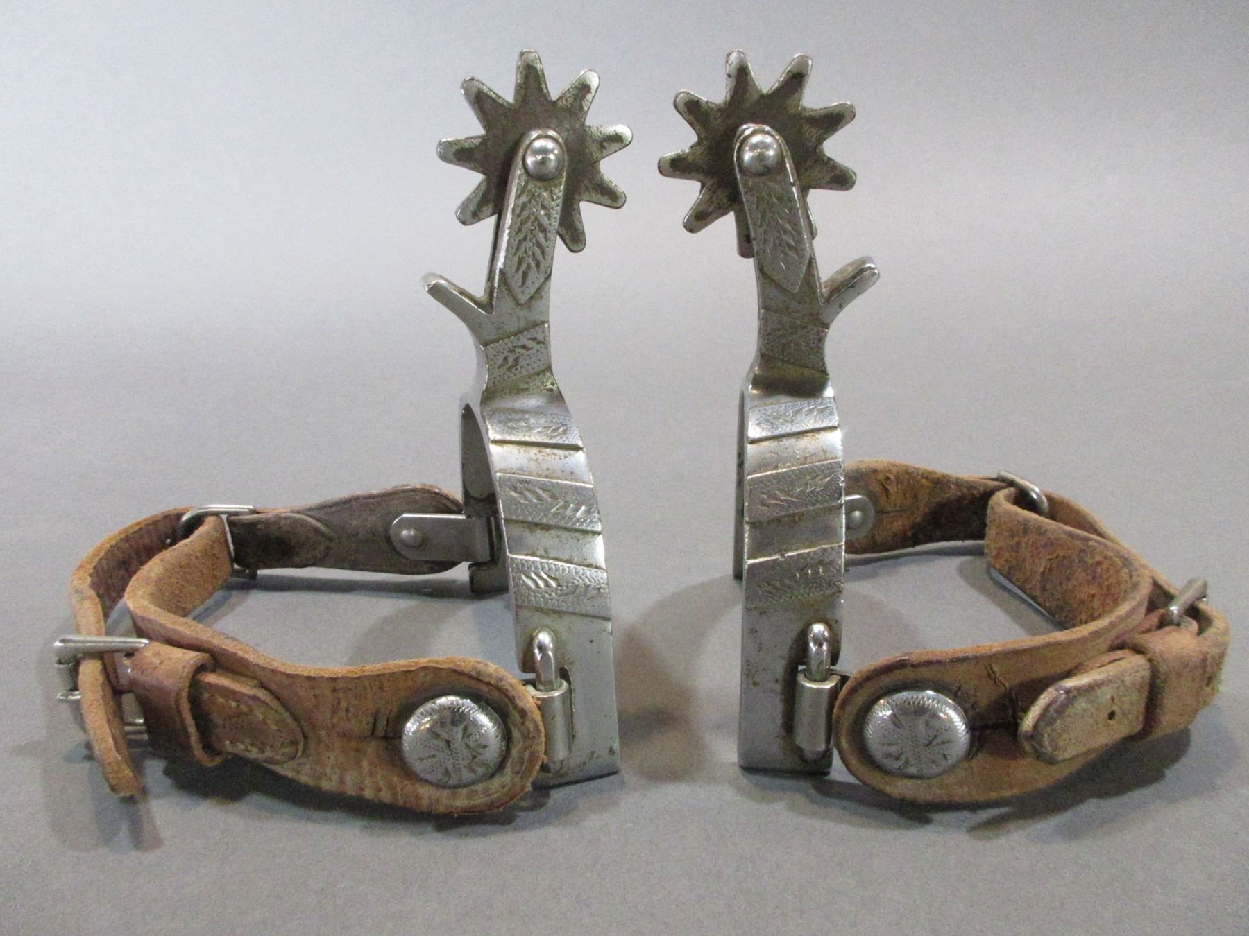 Edge Marked Crockett Overlaid Spurs- .8" Bands- 2.25" Shanks- 9 Point Rowels- Straps- Chap Guards