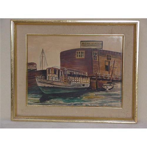 <table width="100%" border="0" cellspacing="0" cellpadding="4"><tr><td><em> </em></td></tr><tr> <td width="100%"> Framed watercolor of several boats at dockside under a billboard that reads Edge Water. Framed size 15 1/4'' X 12 1/4'', signed lower right Morton Grossman, 1941. </td></tr><tr> <td> </td></tr><tr> <td>Reference #: 3249_105</td></tr><tr><td>Condition:Good</td></tr><tr><td>Year:1940s</td></tr><tr><td>Title:Edge Water Watercolor</td></tr><tr><td>Location:Fort Lauderdale, Florida</td></tr></table>