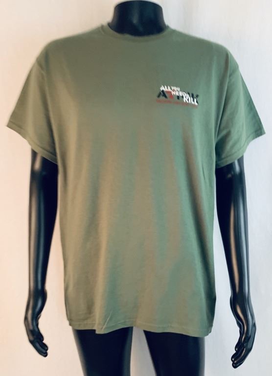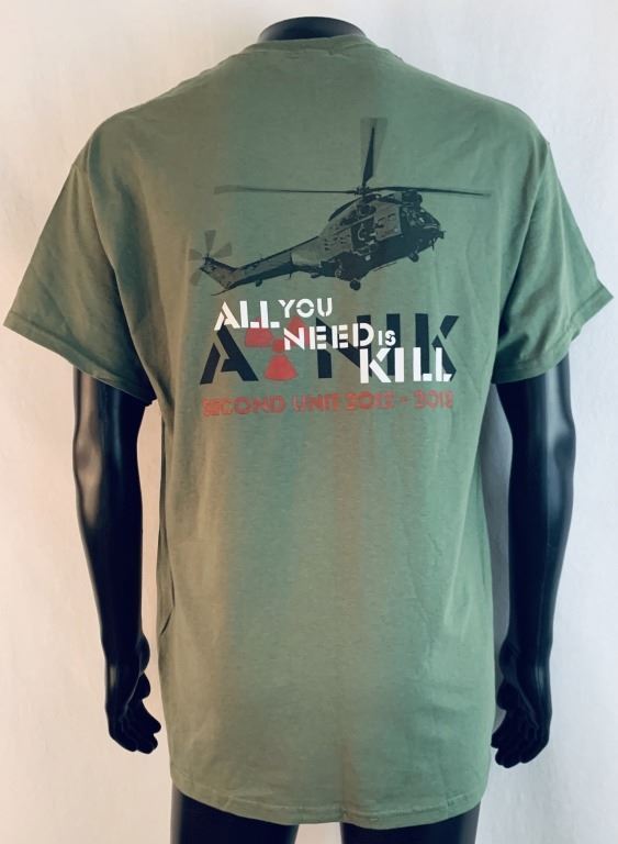 Original t-shirt given to the 2nd unit crew on the production of the science fiction action film 'Edge of Tomorrow' (2014), where a soldier fighting aliens gets to relive the same day over and over again, the day restarting every time he dies. Starring Tom Cruise and Emily Blunt.