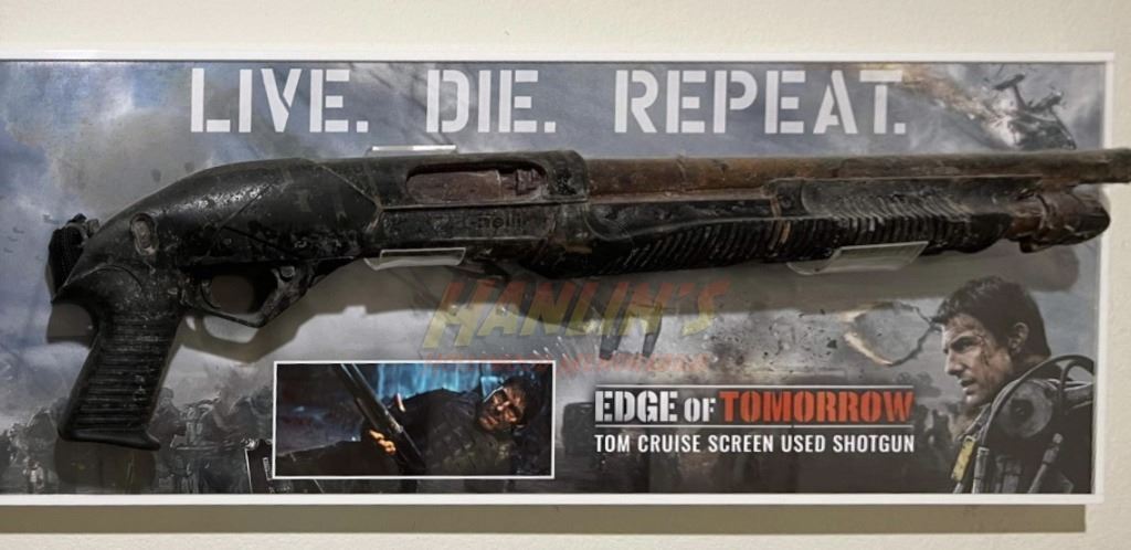 Original shotgun used by "Cage", played by Tom Cruise in the production of the science fiction action film 'Edge of Tomorrow' (2014), where a soldier fighting aliens gets to relive the same day over and over again, the day restarting every time he dies.