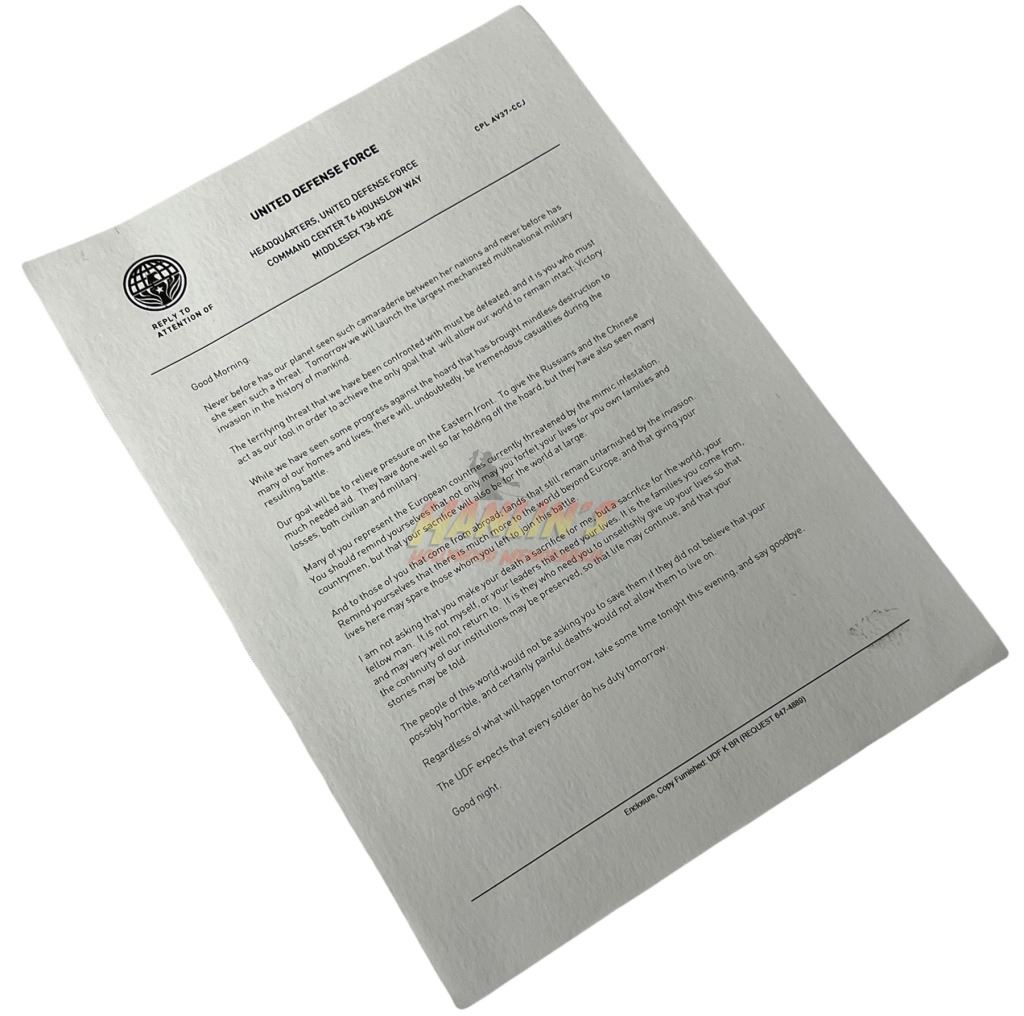 Original memo speech update for human progress against the Mimic invasion used on the production of the science fiction action film 'Edge of Tomorrow' (2014), where a soldier fighting aliens gets to relive the same day over and over again, the day restarting every time he dies.