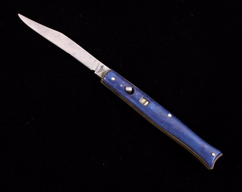 This a very rare Edgemaster spring assist push button switchblade knife. The knife has a blue marbled swirled fishtail double sided handle and locking mechanism. These were made from 1954 to 1958 and very few still exist. Closed is 4 1/8"L and has a 3 1/4" blade. In good condition and functioning.