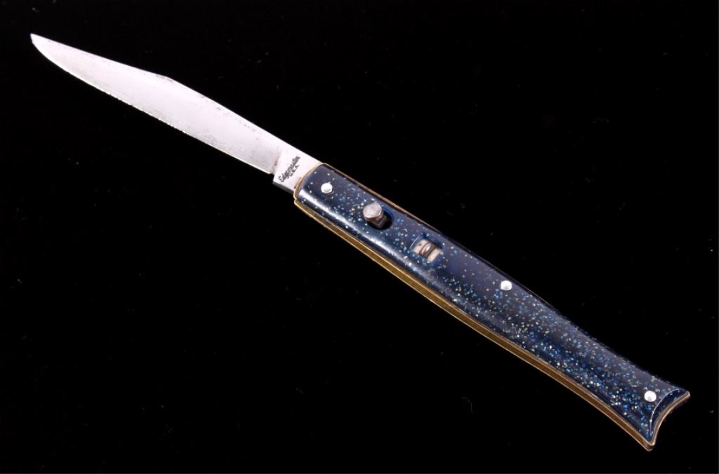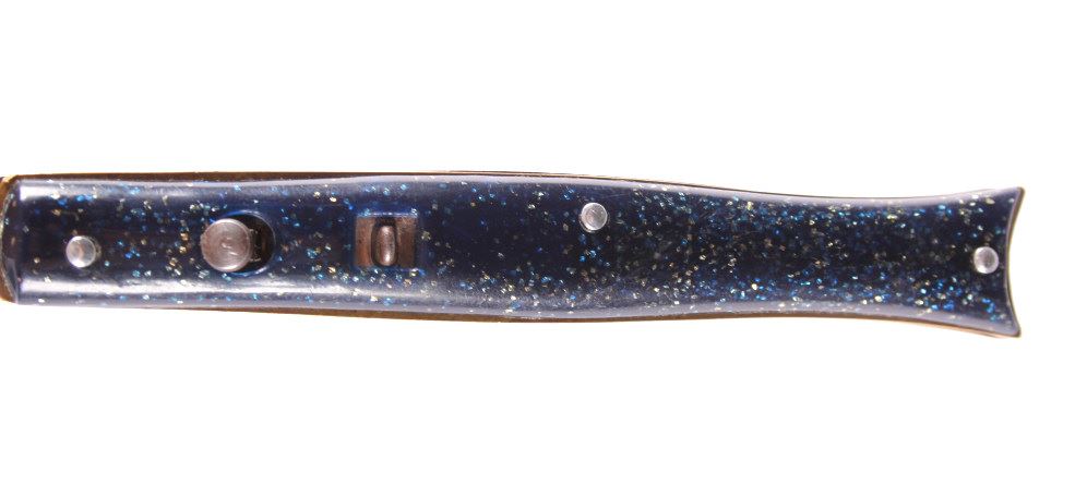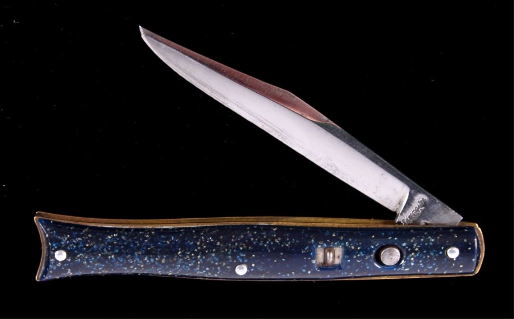 This a very rare Edgemaster spring assist push button switchblade knife. The knife has a sparkle fishtail double sided handle and locking mechanism. These were made from 1954 to 1958 and very few still exist. Closed is 4"L and has a 3 1/8" blade. Works Great.