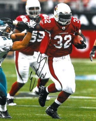Edgerrin James signed a four-year, $30 million deal with the Arizona Cardinals on March 23, 2006. James went through a stretch of 10 games out of the 2008 season where he carried the ball only 20 times. Through this time, Ken Whisenhunt brought him in strictly as a pass protector. In Week 17 against the Seattle Seahawks, James carried the ball 14 times for 100 yards. In the Cardinals' first playoff game since 1998, James averaged 4.7 yards per carry and ran for 100 yards. In the Divisional round of the playoffs, James rushed for 57 yards and a touchdown in the Cardinals' upset victory over the heavily favored Carolina Panthers. James rushed for 73 yards in the Cardinals' 32-25 win over the Philadelphia Eagles in the NFC Championship game. James rushed 9 times for 33 yards in the Cardinals' 27-23 loss to the Pittsburgh Steelers in Super Bowl XLIII. Edgerrin James has hand signed this Arizona Cardinals 8x10 Photo. certificate of Authenticity from Athlon Sports.