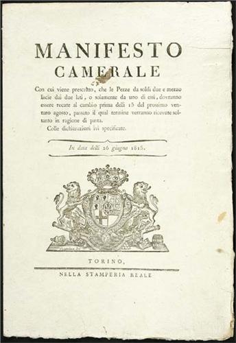 - Regno di Sardegna - Vittorio Emanuele I (1802-1821) - Editto 26.6.1815 concernente il ritiro e cambio delle monete consunte da soldi 2 e mezzo Quattro pagine con splendido frontespizio