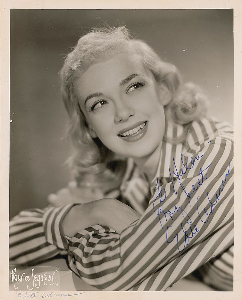 Attractive glossy 8 x 10 publicity photo of Adams wearing a striped shirt, signed and inscribed in blue ink, “To Helen, My best, Edie Adams.” Mild overall surface creases and impressions, ballpoint notation to lower left, and brush to end of the signature, otherwise fine condition.