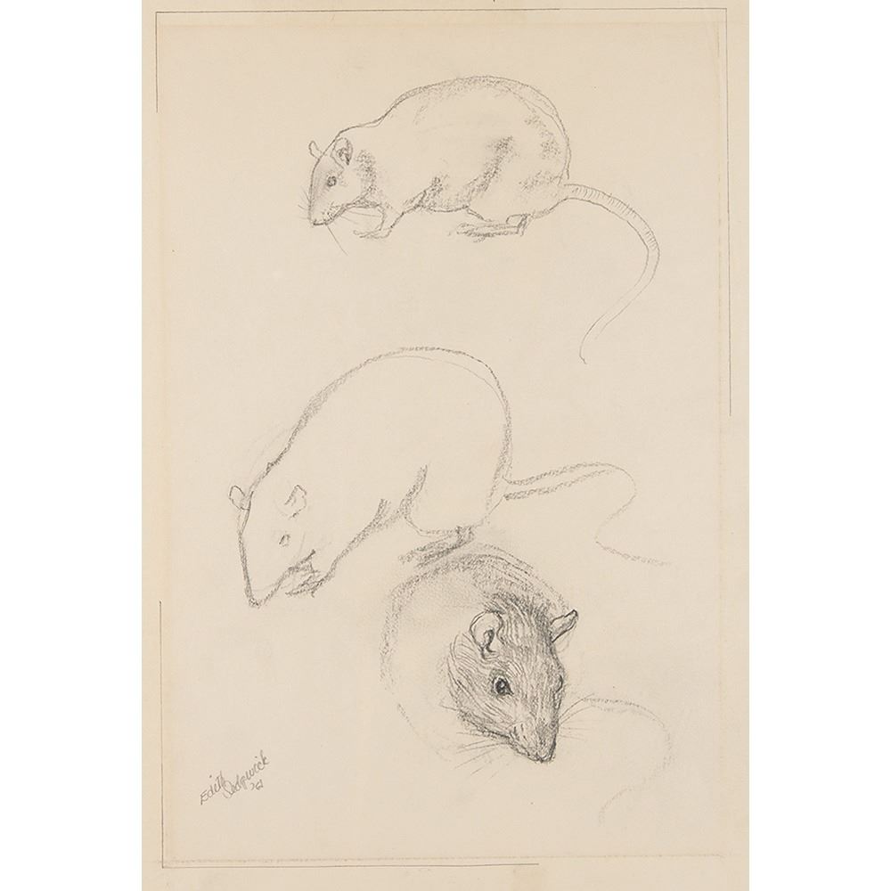 Original model sketches of rats by Edie Sedgwick, accomplished in graphite on an off-white 9.5 x 13.5 sheet of sketching paper that contains three drawings of the rodents, signed in the lower left, “Edith Sedgwick, ‘61.” Matted to an overall size of 10.5 x 14.75. In fine condition.
