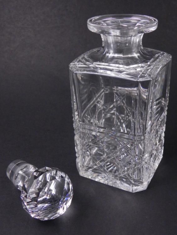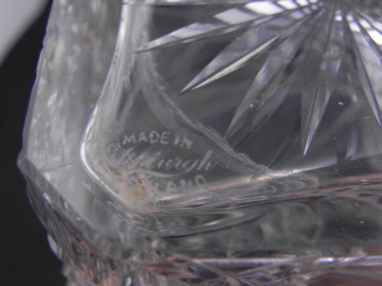 This is a crystal Whisky Decanter, marked on the bottom: Made in Edinburgh, Scotland. It features a cross hatch and checkerboard design on the lower portion, and multi-faceted stopper. The dimensions are 3 3/4 x 9 3/4 inches. It is in very good condition, with couple tiny chips on the stopper, which are barely noticable. * * This is a traditional decanter from a fine quality Scottish maker.