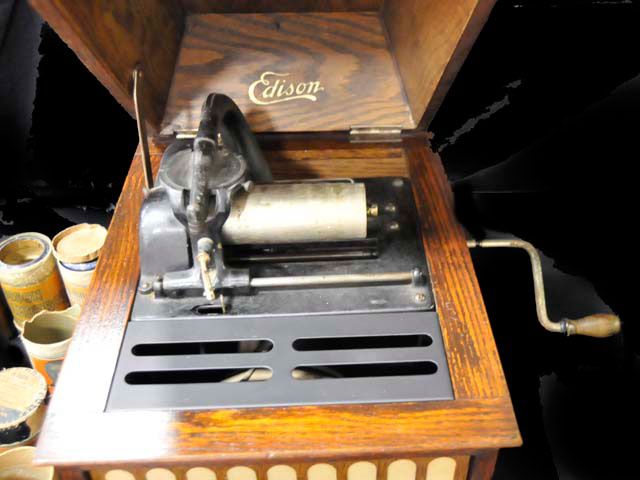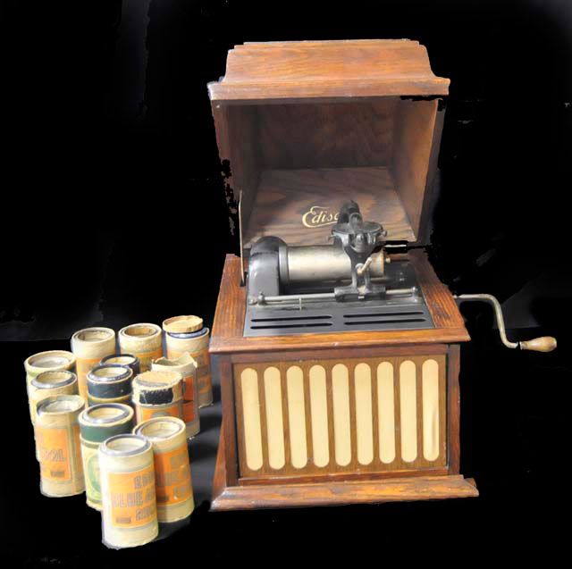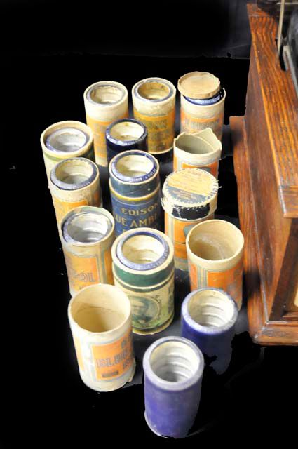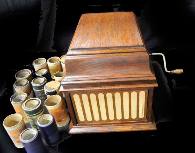 Oak case with 12 cylinders, in good working order. Approx. 12.5" H x 11.5" W x 14.5" D. Please read our terms of sale.