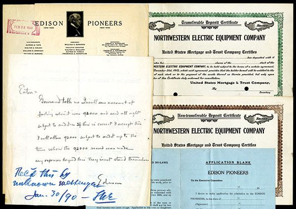 Lot of 3 Edison related Ephemera items; 1). Letter to Edison Pioneers with membership form. Edison pioneers was a group formed by and for associates and employees of Thomas Edison; 2). 191x, 2 Northwestern Electric Equipment Co. Specimen Stock certificates, VF condition; 3). 1890, Letter written in pencil and signed by Edison discussing expenses written on the back of "Central Station Construction Dept." Letterhead with Thos. A. Edison, 65 Fifth Ave. NY on top, VF condition.