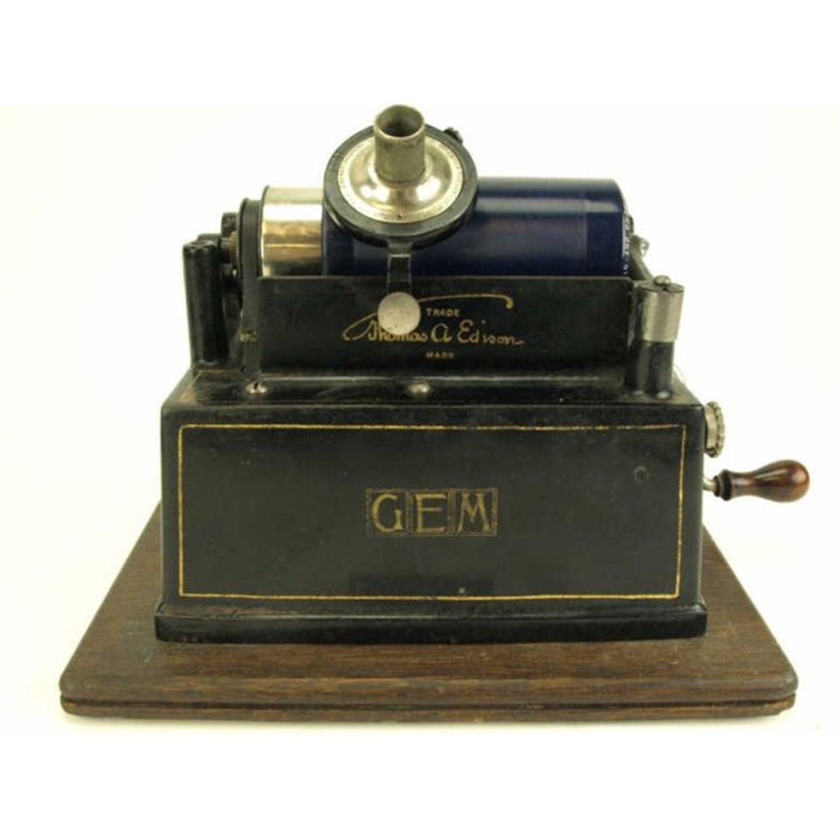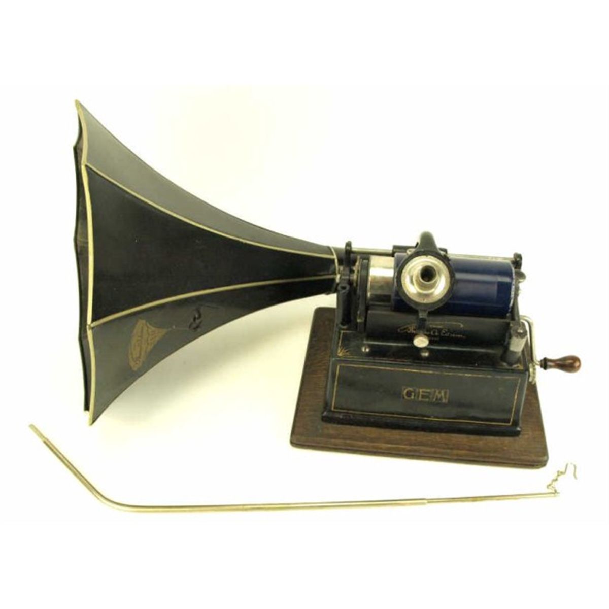 Edison Gem cylinder player SN G138790 cylinder player functions and produces sound however crank spring sporadically slips. Includes Gem horn and one cylinder with top missing.