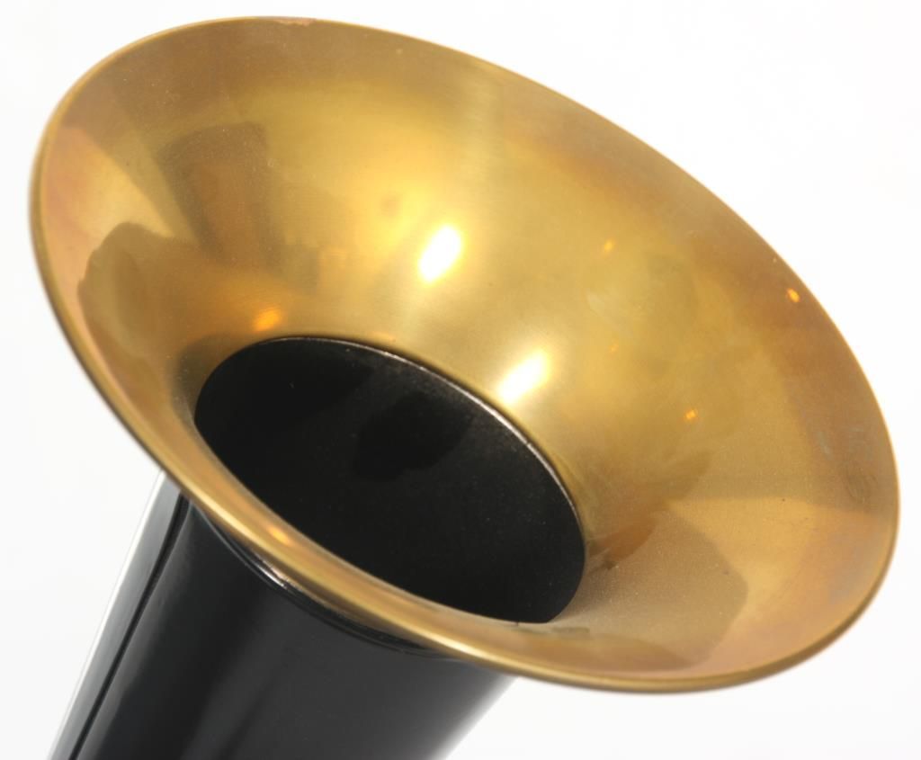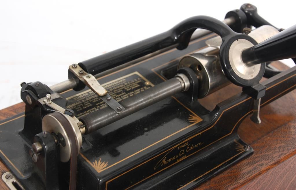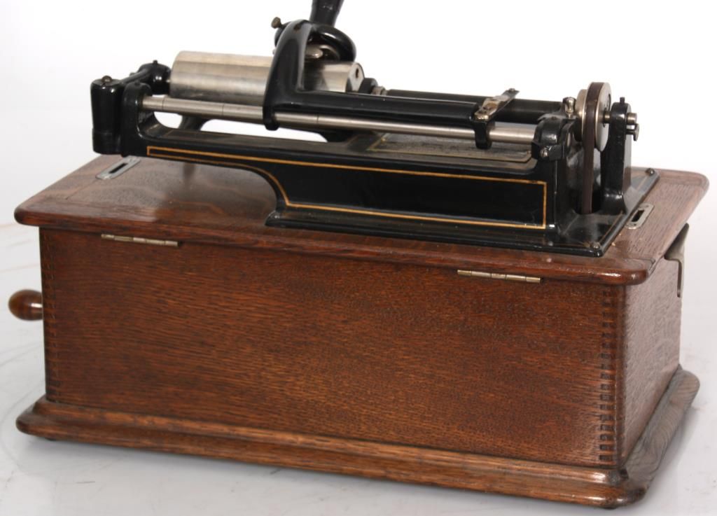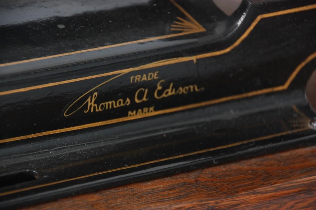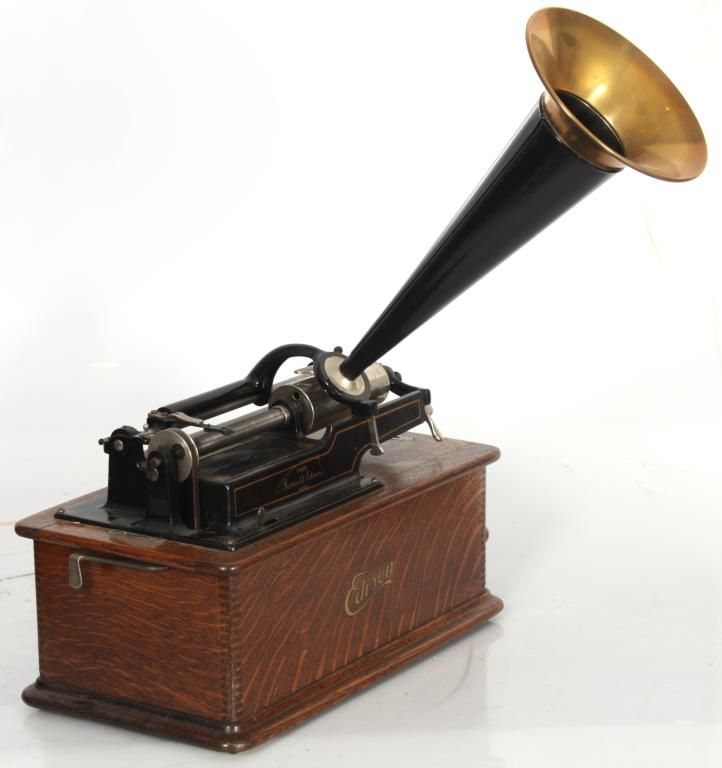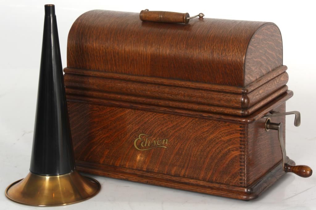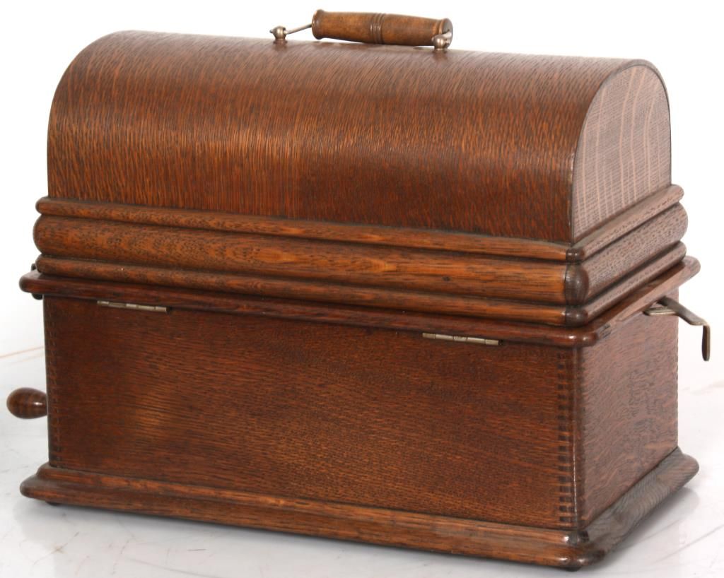 Edison Home Cylinder Phonograph. Oak case has a finger jointed construction and domed cover; painted black chassis, string driven mechanism and model K Combination receiver with switch, playing 2 and 4 minute records. The horn has a flared brass bell and black painted cone, 14 in. long x 7 in. dia. Signed on a brass tag “Edison Home Phonograph” and serial number 242715. In good condition, spring winds and cylinder turns. Overall dimensions 22 in. high x 16.5 in. wide x 9 in. deep.