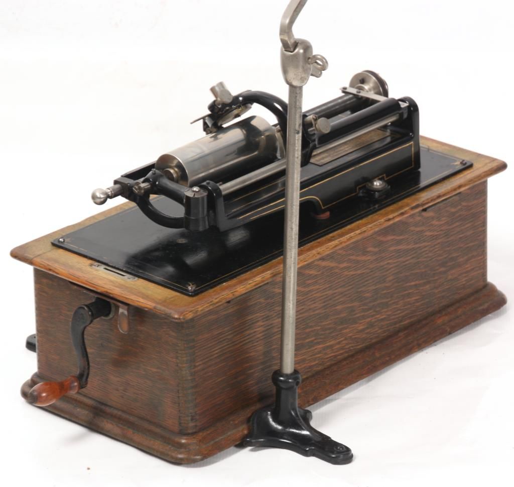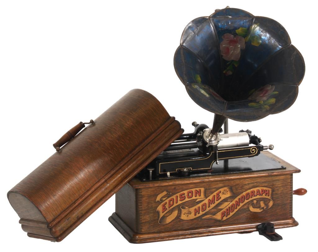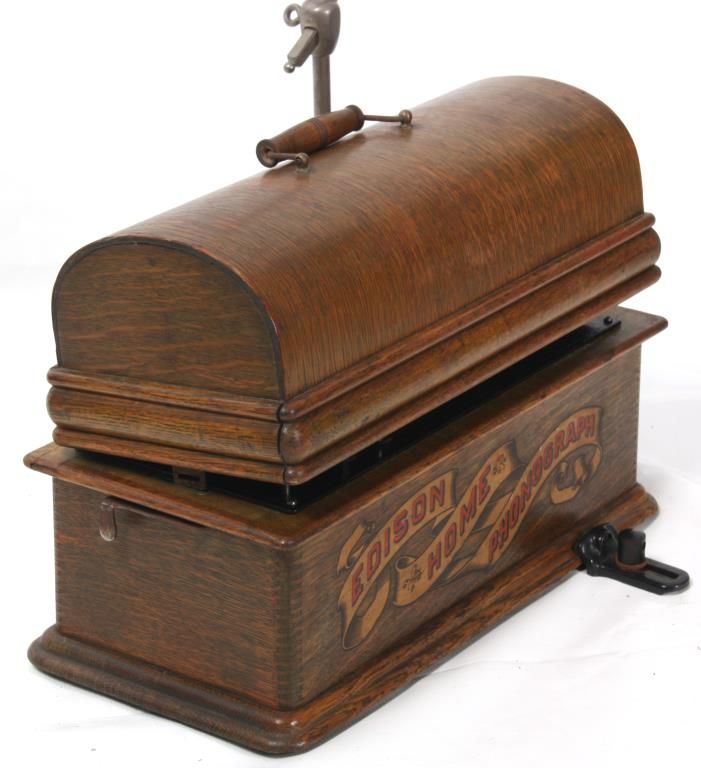 Edison Home Cylinder Phonograph. Oak case with finger jointed corners & domed lid; signed on the front with “Edison Home Phonograph” banner, red lettering and front mounted crane with blue horn painted with pink roses, 13 in. long x 12 in. dia. Black painted chassis and base plate has gilt stenciling; spring driven mechanism is signed with Thomas A. Edison brass tag with serial number H44752. In good original finish and condition. Overall dimensions 24 in. high x 19 in. wide x 12 in. deep.
