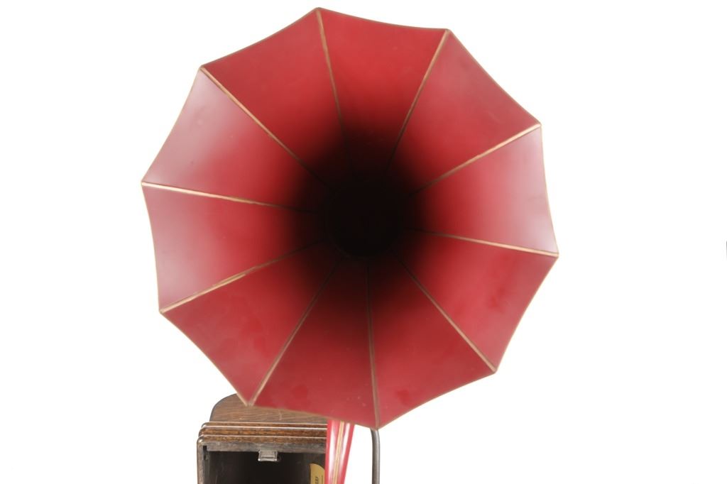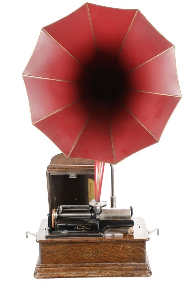 Featured in this lot is a Rare Edison Phonograph, Home version, Model K Reproducer, circa 1904-1909, in original Edison banner golden oak hardwood case. Serial number 393491D. This model is equipped with 2 and 4 minute switch. Thomas Edison invented the phonograph in 1877, which was developed as a result of Edison's work on two other inventions, the telegraph and the telephone, but it really didn't make its way into American homes for at least twenty years. The removable red Cignet horn has the self-supporting crane balanced by a foot that clips under the back of the case. In general, the historical progression was from conical horns to belled horns to petalled horns. This phonograph is in amazingly well-preserved condition, appears intact ,though it has not been tested for functionality. The Cignet horn disassembles into two parts as does the self-supporting crane. Whole phonograph measures 38.5"H x 20"W x 20"D assembled. Horn has a 18.75" diameter mouth opening. In case, phonograph measures 17"L x 9.5"W x 9.5"D. Total combined weight 31lb 1oz.*