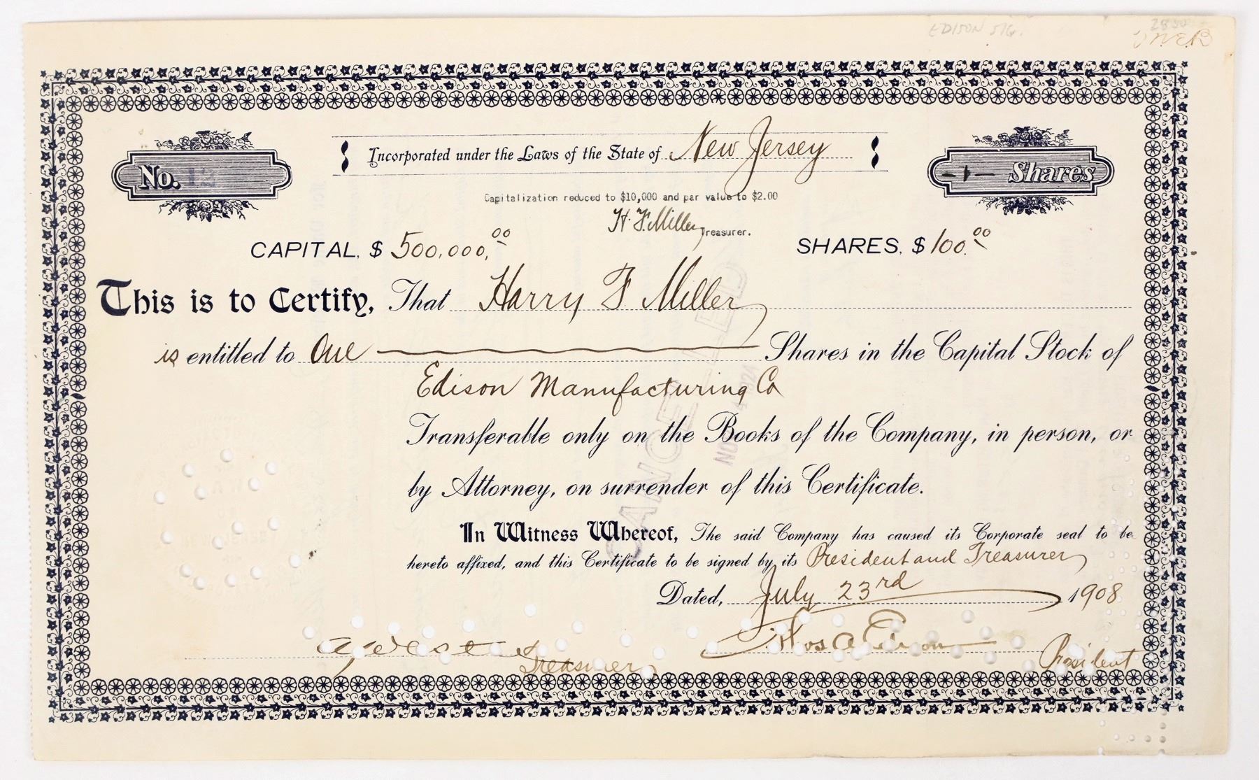 Unique in this group of Edison stocks from Prag. This certificate is almost homemade, with the company name handwritten. Signed by Thomas A. Edison as president. Signature is heavily punch cancelled. Reverse shows the shares were transferred to Thomas A. Edison, Inc. in 1924. This company was organized in December 1889 as Edison's personal business and was incorporated in New Jersey on May 5, 1900. Originally formed to manufacture and market the Edison-Lalande primary battery, the company manufactured and sold batteries for use with telegraph, phonoplex, and telephone systems, as well as for phonographs, dental equipment, medical instruments, and other machinery. It also produced kinetoscope films, kinetoscopes, wax for phonograph cylinders, x-ray equipment, and electric fans. The company had a factory at Silver Lake, New Jersey. The company's assets and property rights were assigned to Thomas A. Edison, Inc., in February 1911. It was dissolved on November 9, 1926. Thomas Edison (1847–1931) was an American inventor, entrepreneur, and one of history's most prolific innovators, holding over 1,000 patents. He developed groundbreaking technologies including the phonograph, the incandescent light bulb, and the motion picture camera. Edison's creation of the first industrial research laboratory in Menlo Park, New Jersey, revolutionized the process of invention by fostering teamwork and systematic experimentation. His work in electrical power led to the founding of the Edison Electric Light Company, which later became part of General Electric. Known as the "Wizard of Menlo Park," Edison's inventions transformed modern life and helped usher in the age of electricity and mass communication.