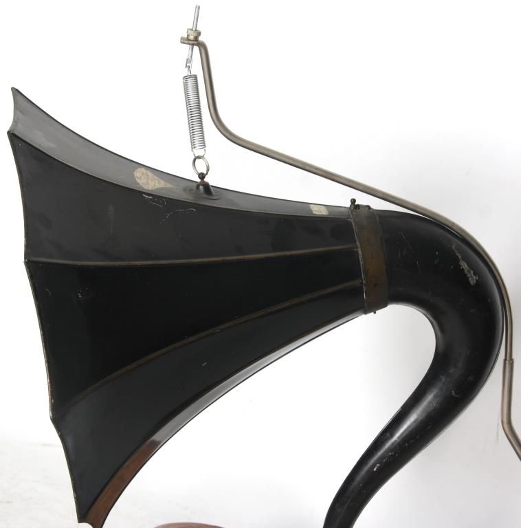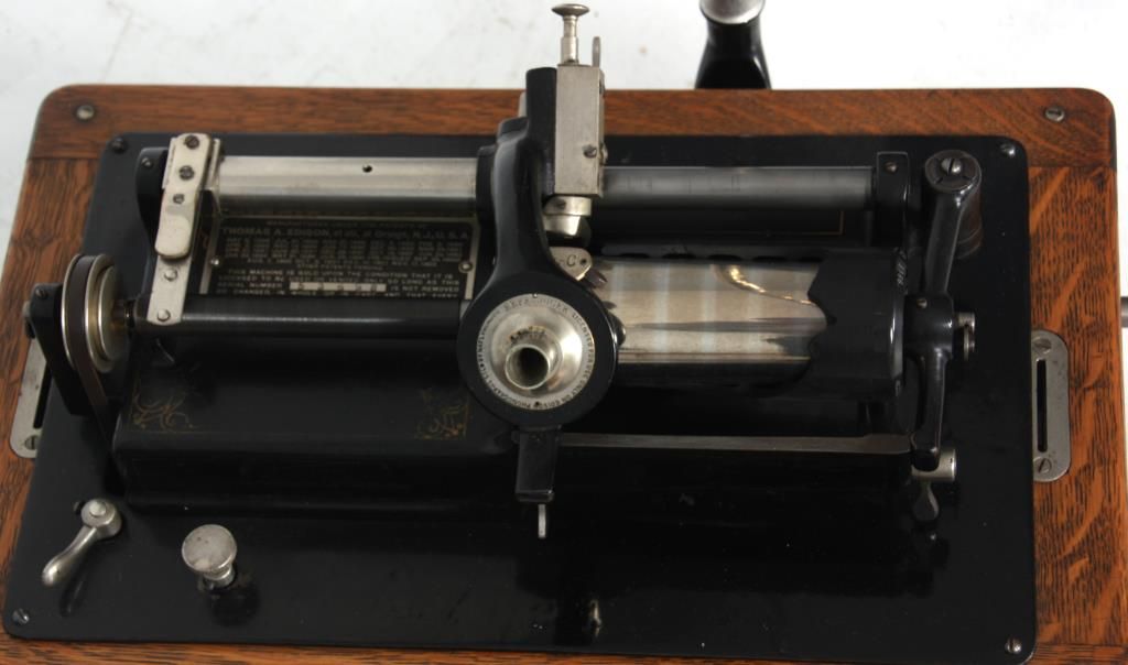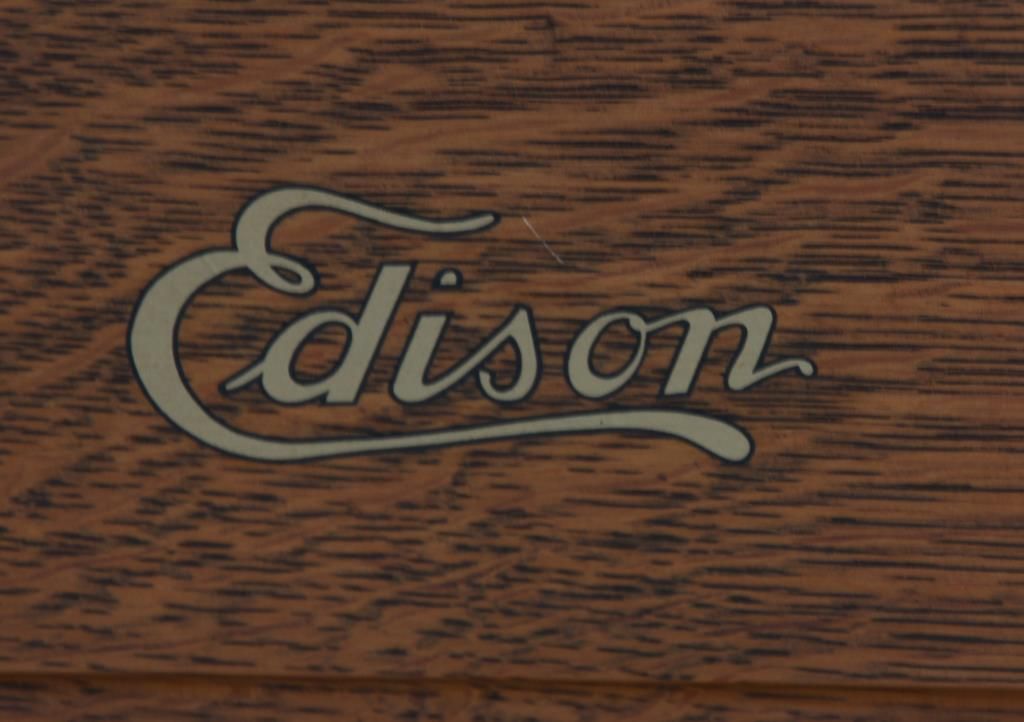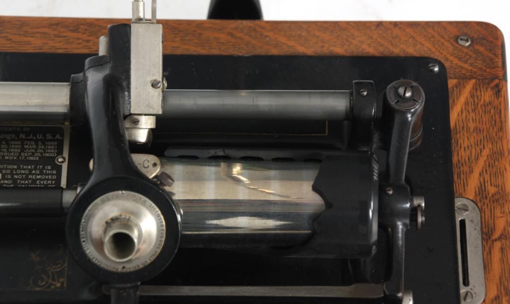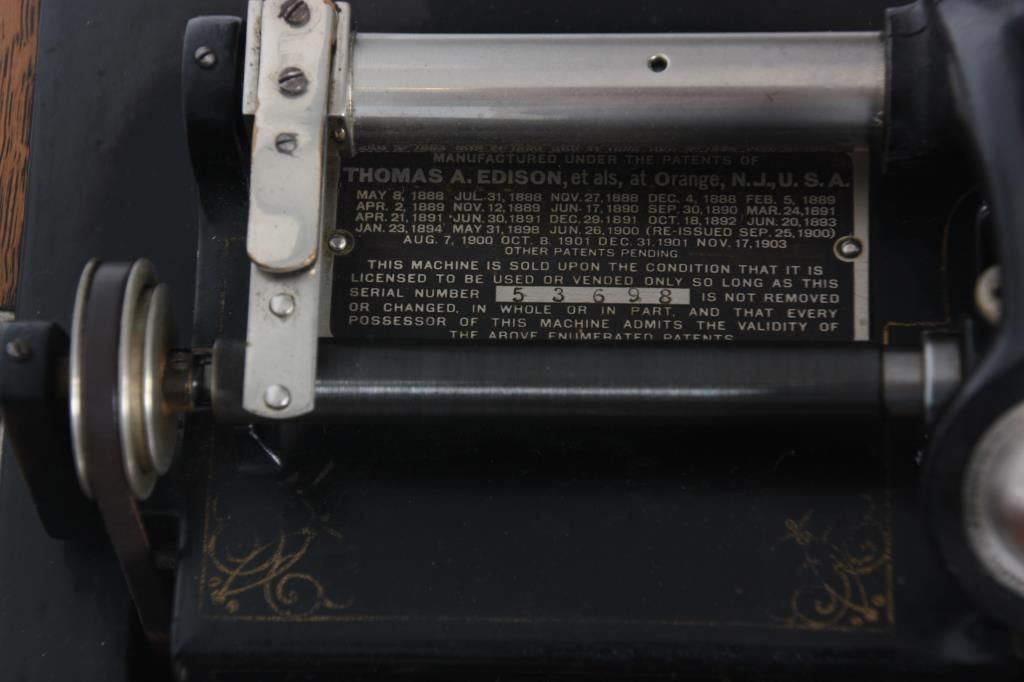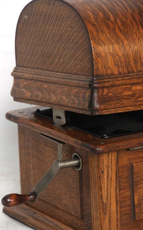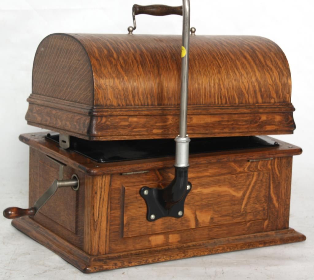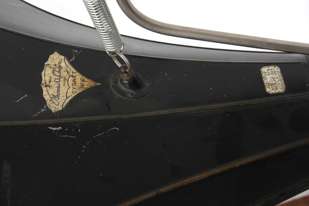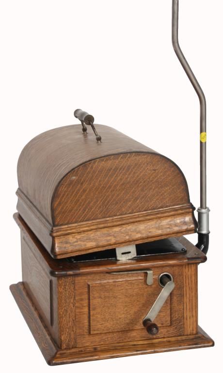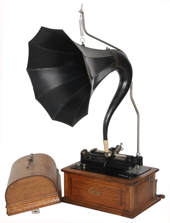 Edison Model B Cylinder Phonograph. Edison Model B Cylinder Phonograph w/ Cygnet Style Horn. Oak case has raised panels on each side and domed lid; rear mounted crane holds a 10 panel black painted Cygnet style horn, 29 in. high x 21 in. deep x 19 in. dia; has a black painted bedplate and chassis with gilt decoration and spring driven movement turning the cylinder records through a Model-C reproducer. Metal tag has serial number 53698. Overall dimensions 38 in. high x 18 in. wide x 22 in. deep.