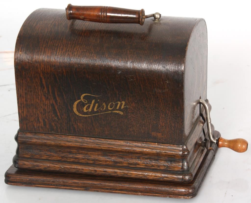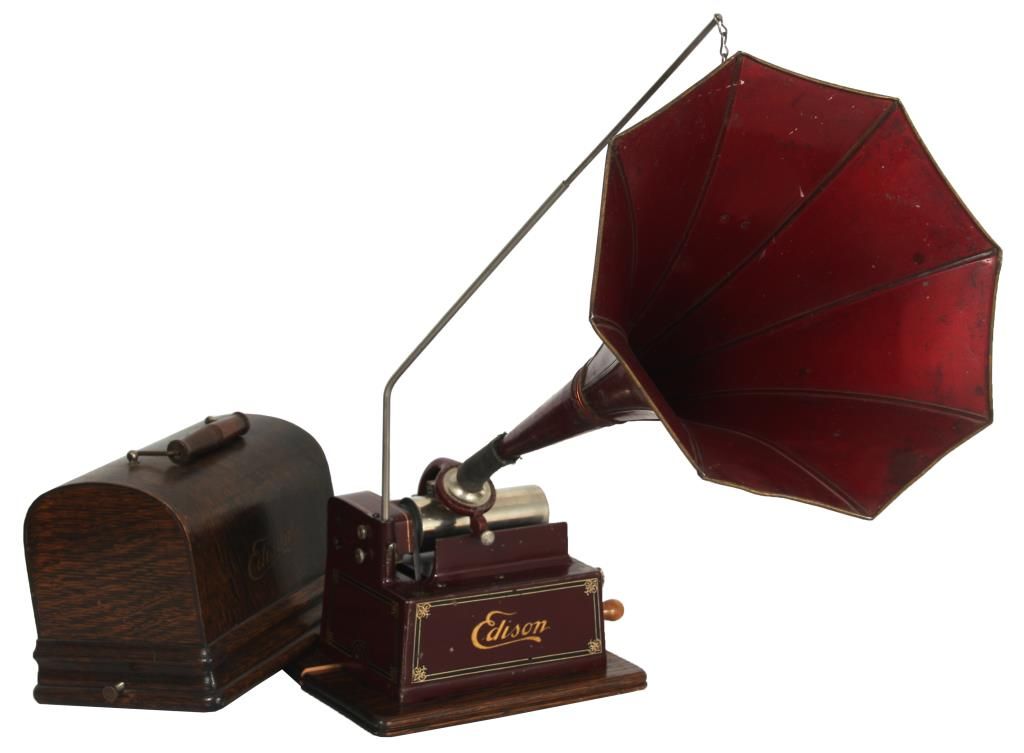 Edison Model D Red Gem Phonograph. Oak case and base with domed lid and turned handle; the mechanism is enclosed in a red painted frame with gilt and black stenciled borders. Combination type mechanism plays 2 & 4 minute duration cylinders, has original crane, model-K combination reproducer and red painted fireside 8 panel horn with gilt ribs, horn measures 19 in. long x 11 in. dia. In good overall condition has some scratching to the red paint. Signed on a metal tag Edison Gem Phonograph, model D and serial number 352823. Case measures 9 in. high x 10 in. wide x 8 in. deep.