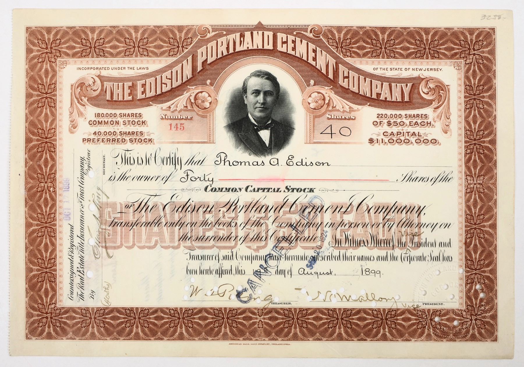Fantastic! No. 145, issued to Thomas Edison in 1899. Signed by him twice on reverse (one at top, another signature lower down has faded ink). Punch cancelled. Thomas Edison (1847–1931) was an American inventor, entrepreneur, and one of history's most prolific innovators, holding over 1,000 patents. He developed groundbreaking technologies including the phonograph, the incandescent light bulb, and the motion picture camera. Edison's creation of the first industrial research laboratory in Menlo Park, New Jersey, revolutionized the process of invention by fostering teamwork and systematic experimentation. His work in electrical power led to the founding of the Edison Electric Light Company, which later became part of General Electric. Known as the "Wizard of Menlo Park," Edison's inventions transformed modern life and helped usher in the age of electricity and mass communication.