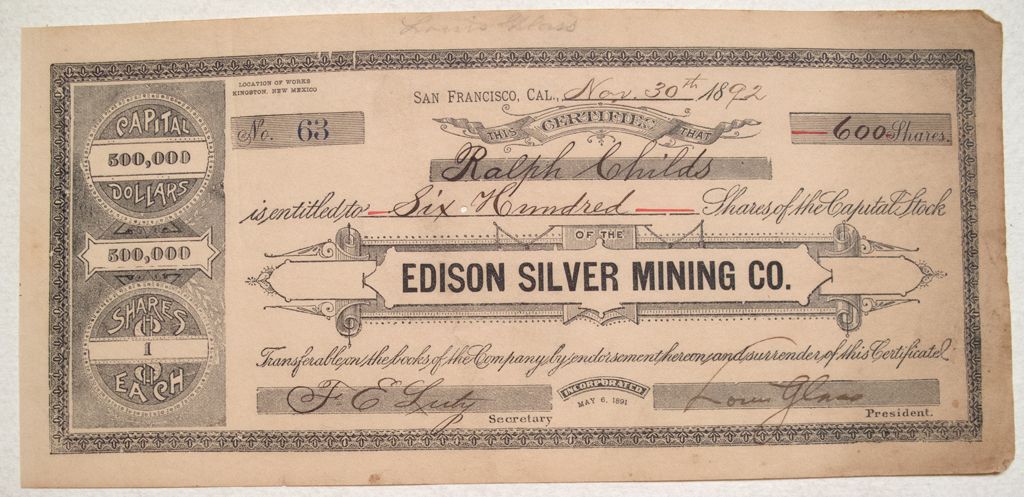 Cert. # 63 for 600 shares issued to Ralph Childes. Signed by F E Luty and Louis Glass. Some wear on right side corners.