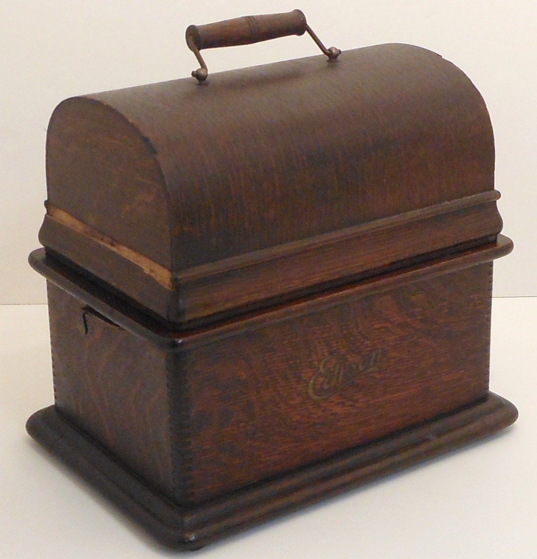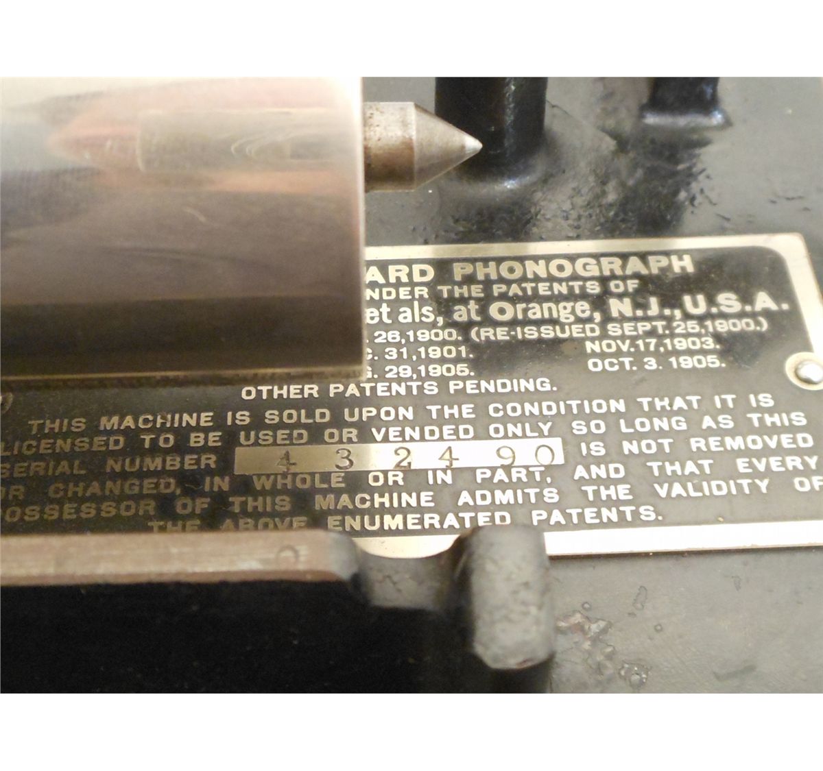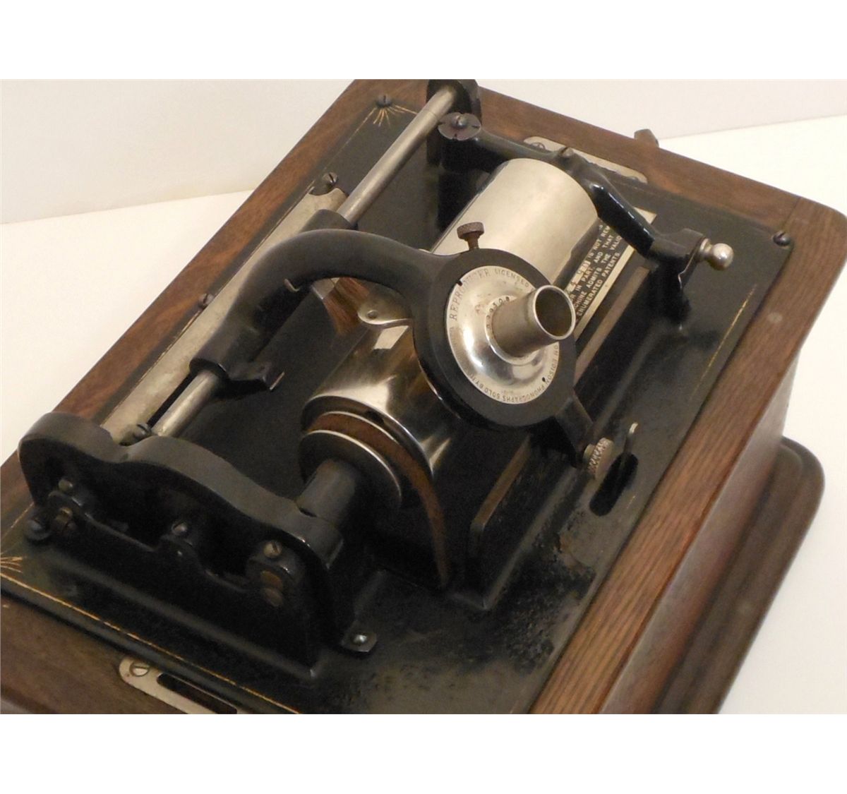 Standard Model B Cylinder Phonograph. 2-min Model C reproducer. Witch's hat horn with a brass bell. Working condition, needs a new belt, oak case is missing a piece of molding.