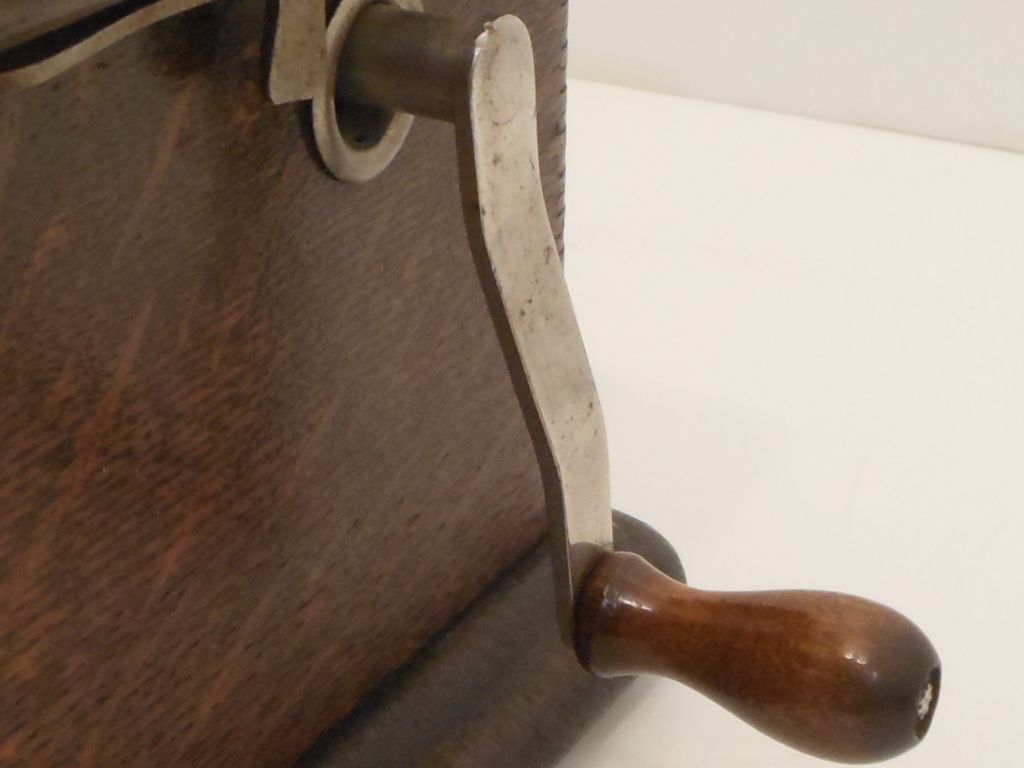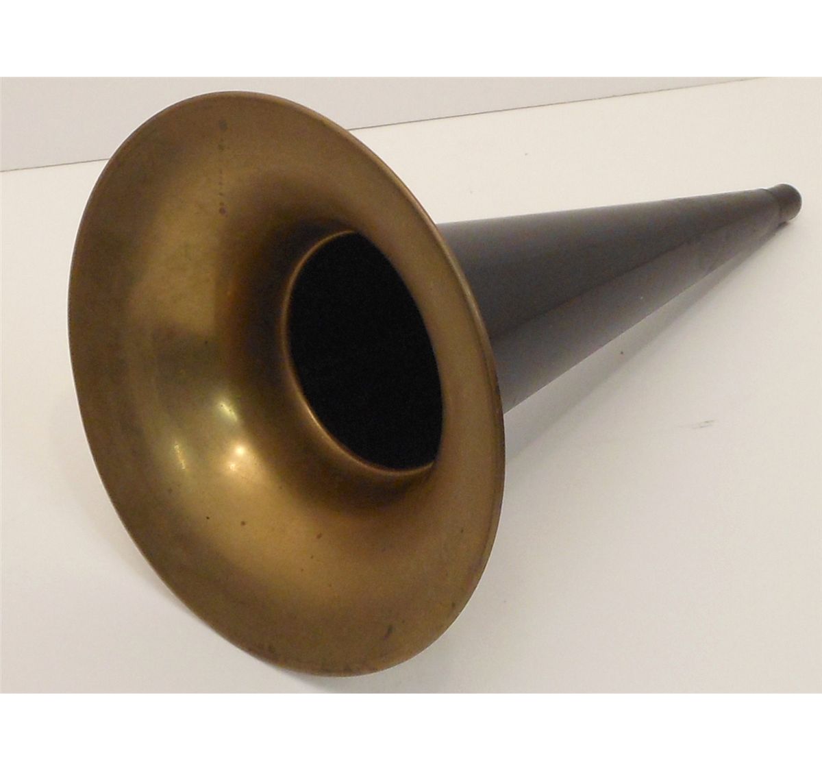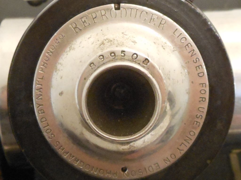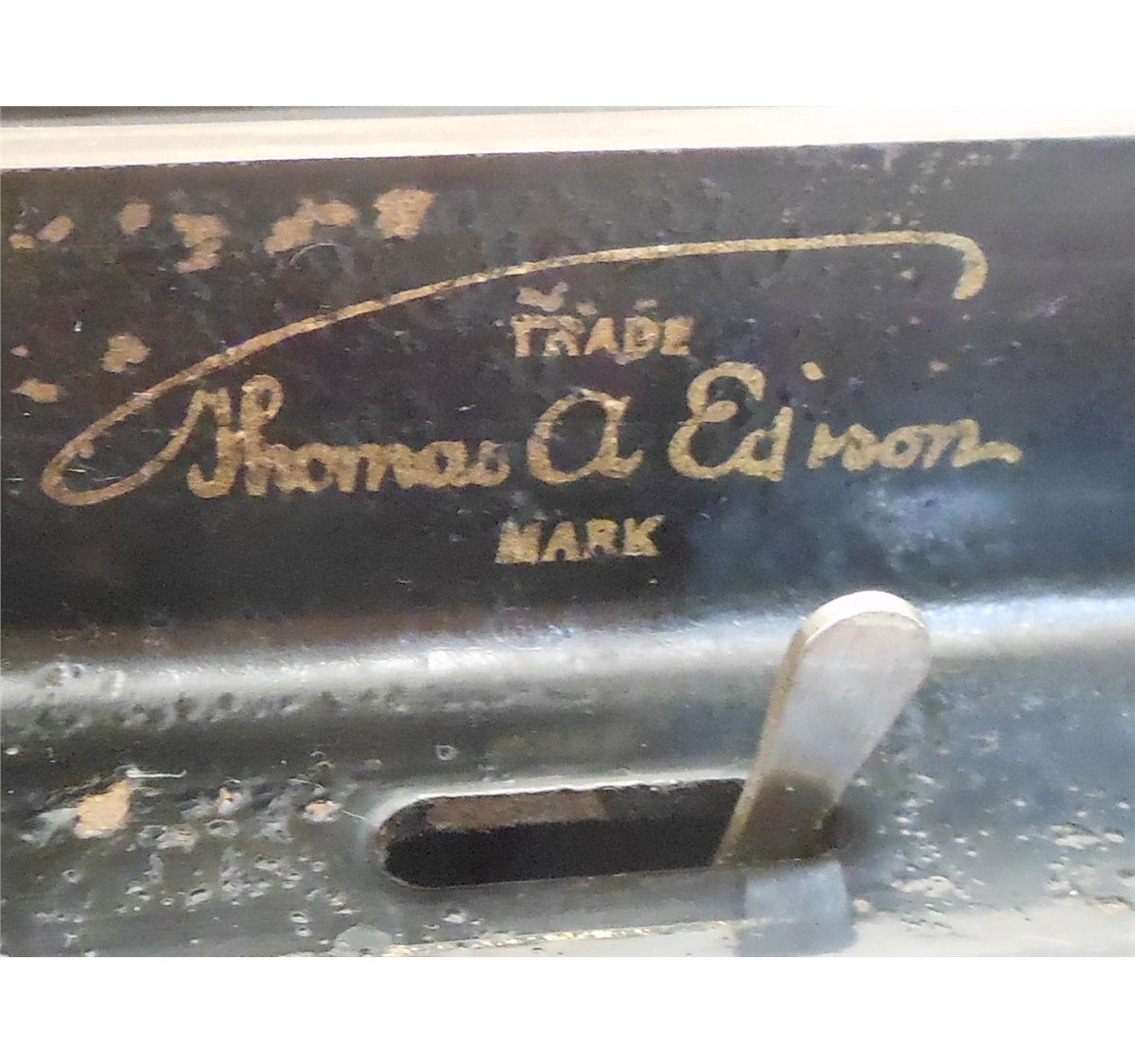 Standard Model B Cylinder Phonograph. 2-min Model C reproducer. Witch's hat horn with a brass bell. Working condition, needs a new belt, oak case is missing a piece of molding.