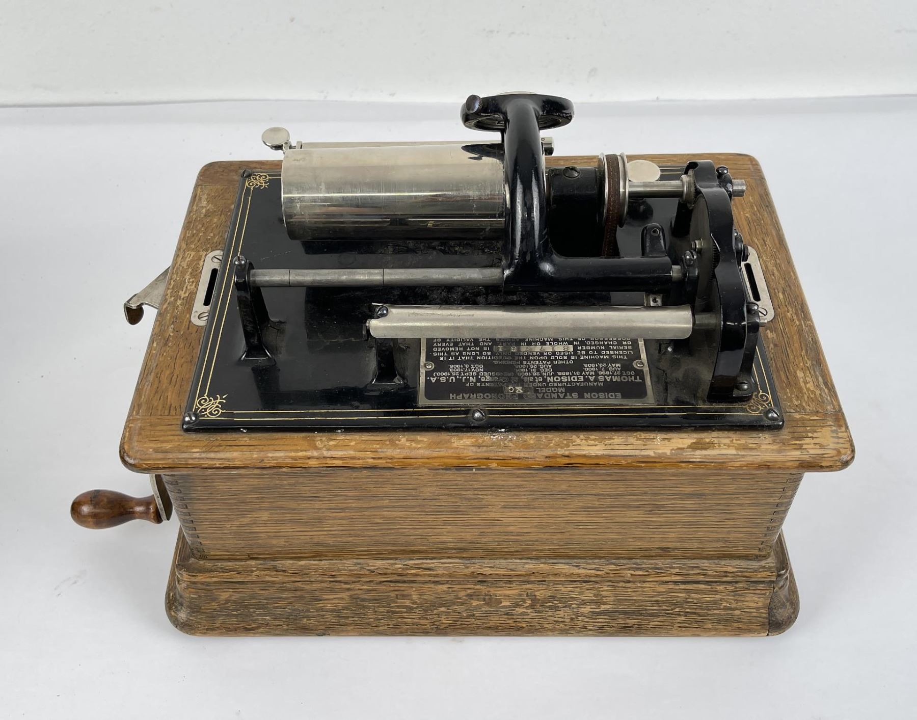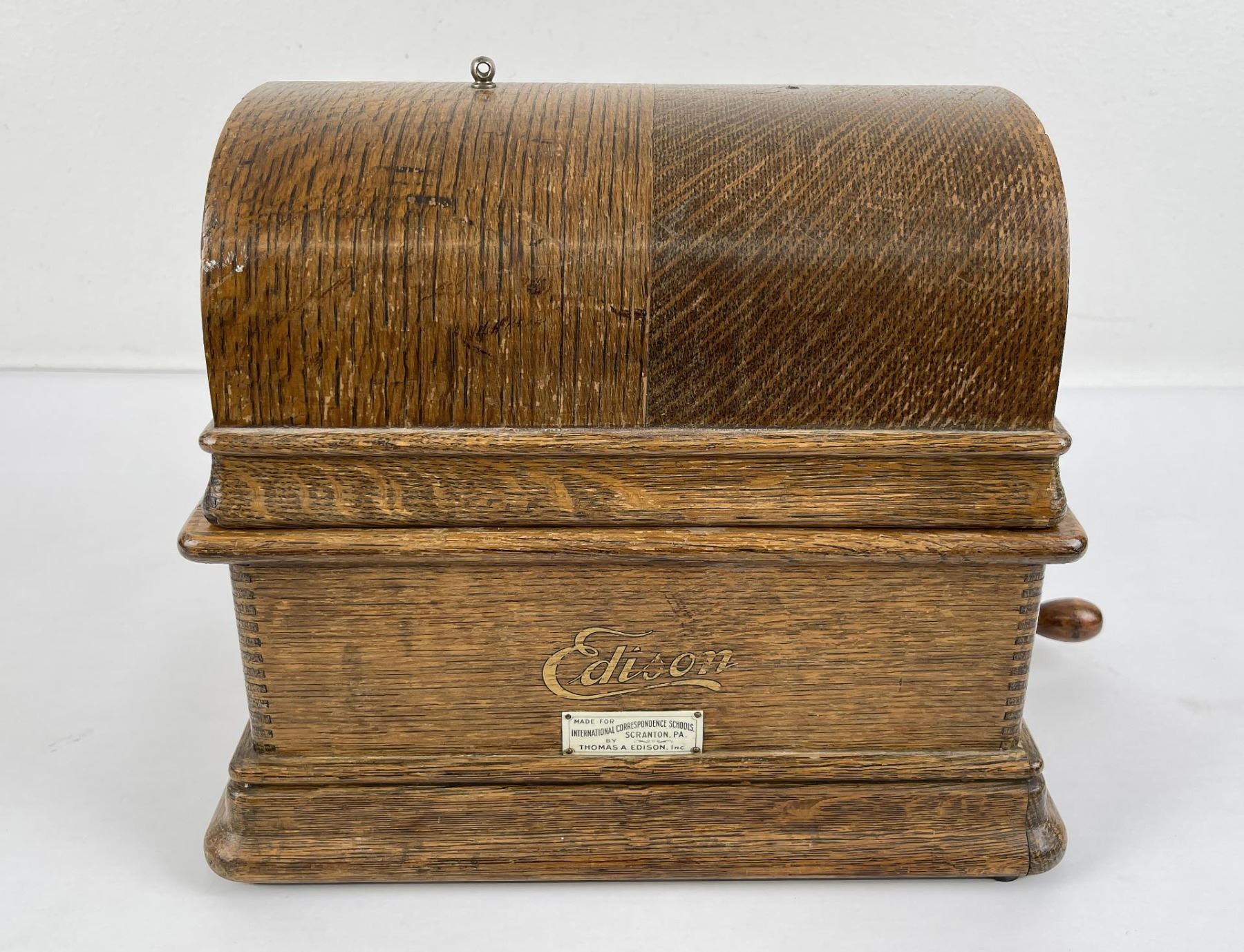 Nice rare old phonograph. Missing carry handle. Plaque says that it was made for the International Correspondence Schools in Scranton Pennsylvania by Edison. No winding Handle.