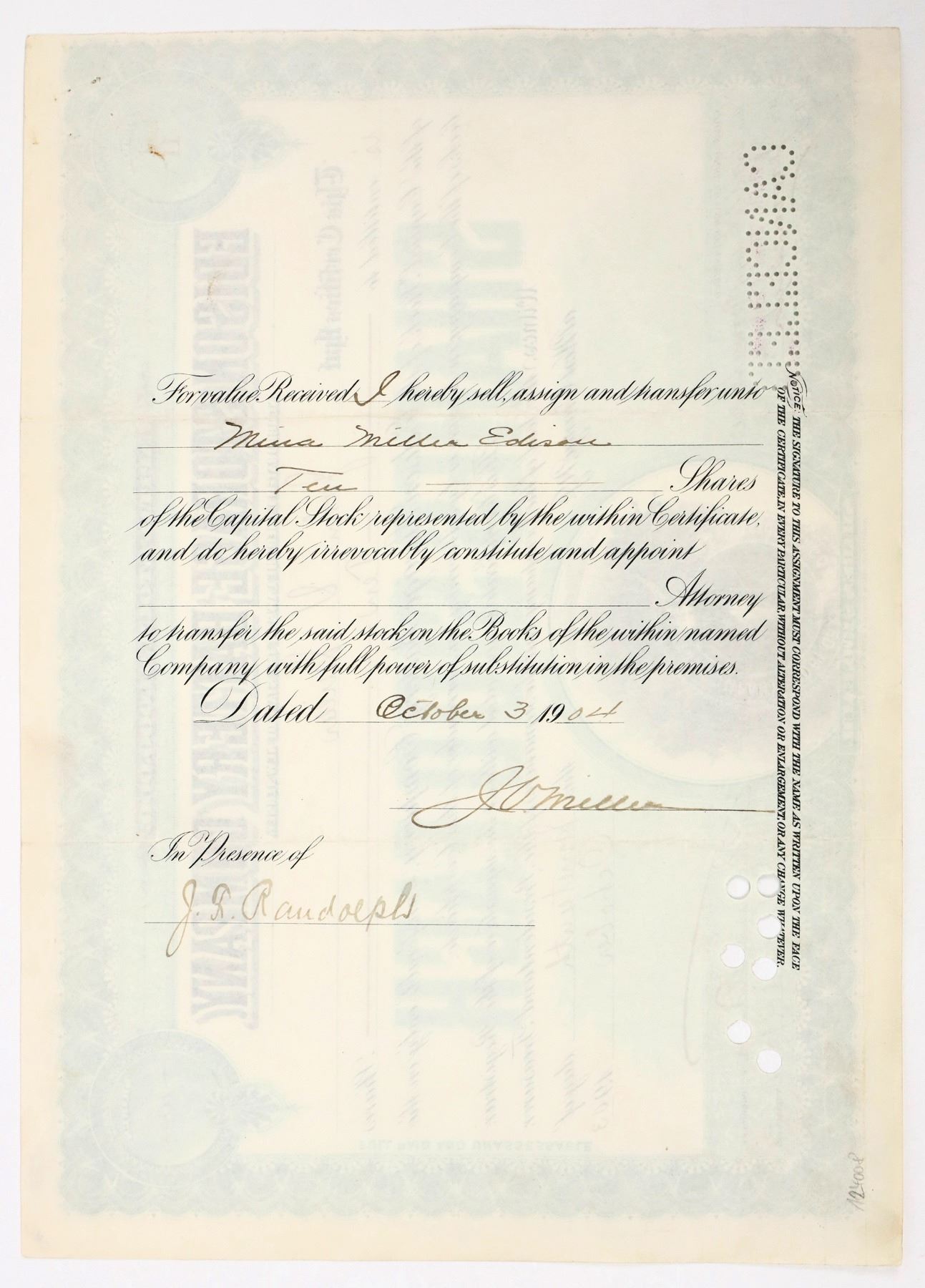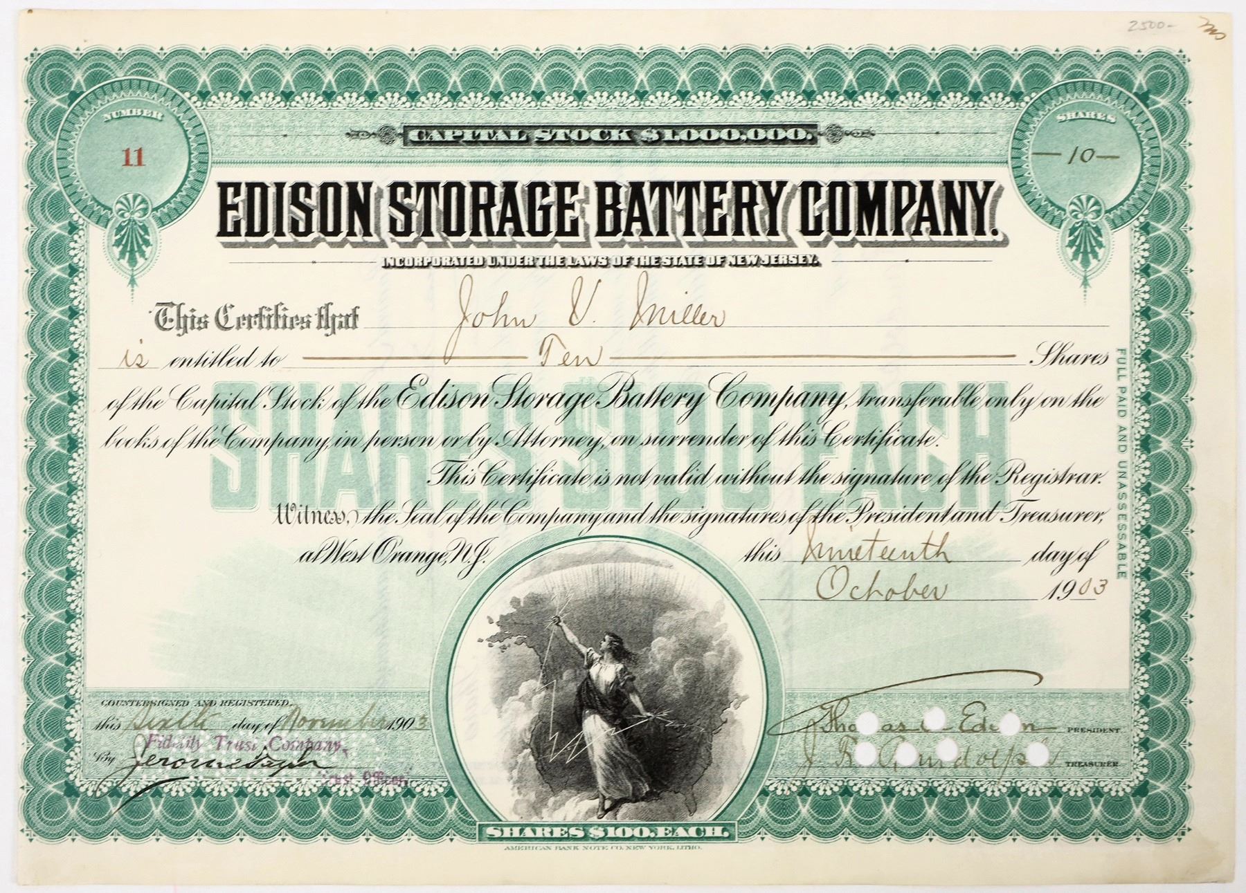 Low certificate no. 11, issued to John V. Miller in 1903. Signed by Thomas Edison as president. Signature is punch cancelled. Green border, black print, allegorical vignette. ABN. Transferred on the back to Mina Miller Edison, Thomas Edison's second wife. This company was organized in New Jersey on May 27, 1901, to develop, manufacture, and sell Edison's alkaline storage battery. It produced batteries for mining lamps, train lighting and signaling, submarines, electric vehicles, and more.