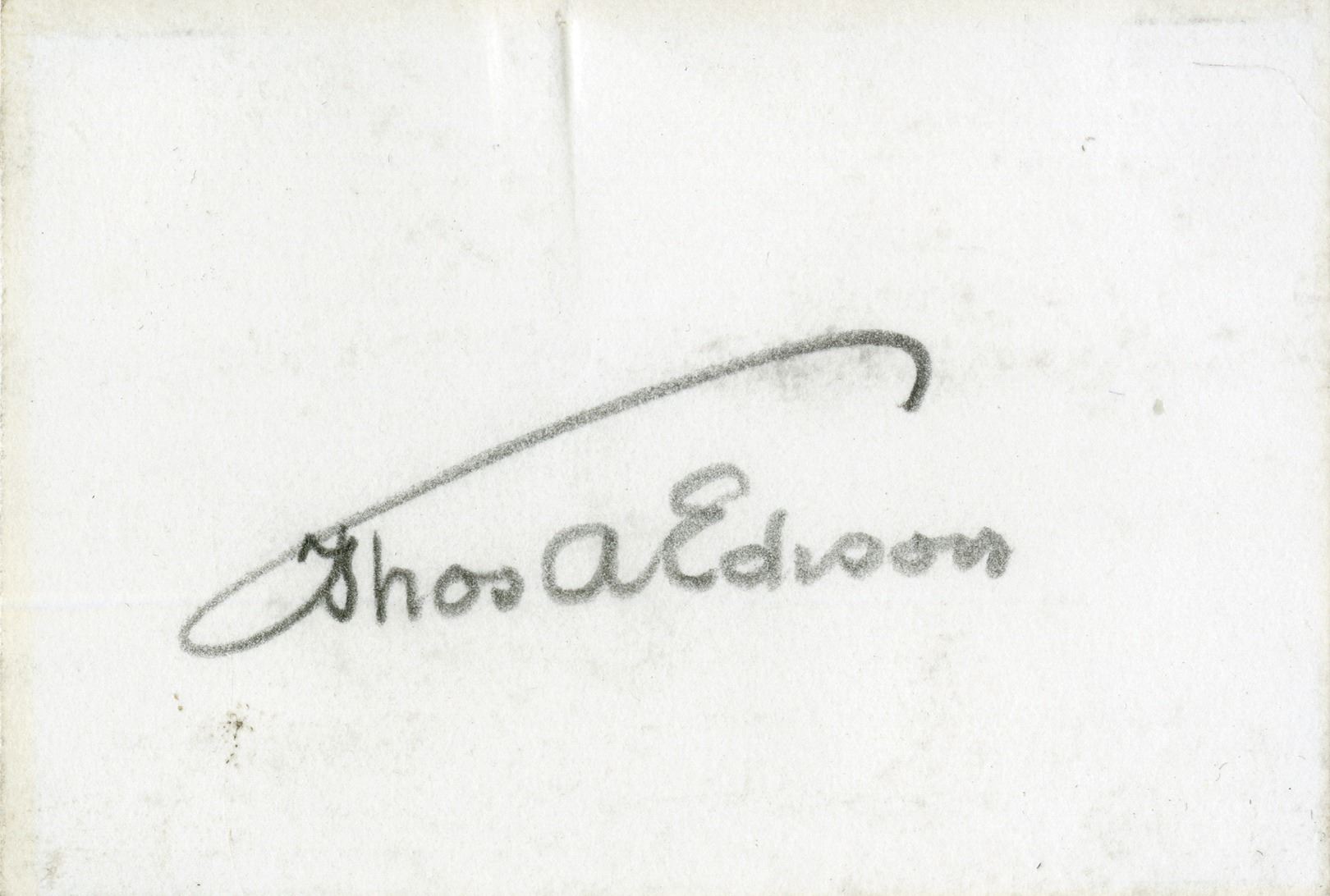 118. * Edison, Thomas. Bold signature ("Thos A. Edison"), in pencil, on a 2.9 x 2 in. (74 x 51 mm), card. Light crease on top from paperclip with mounting remnants on verso.