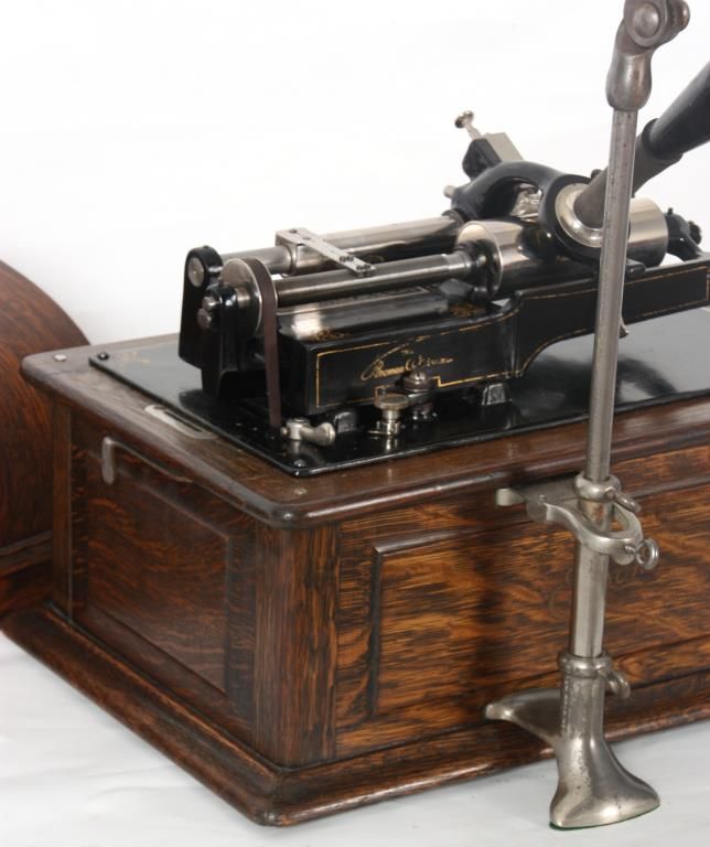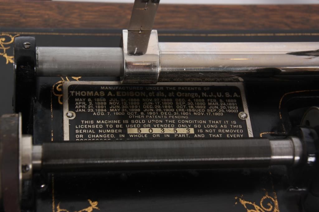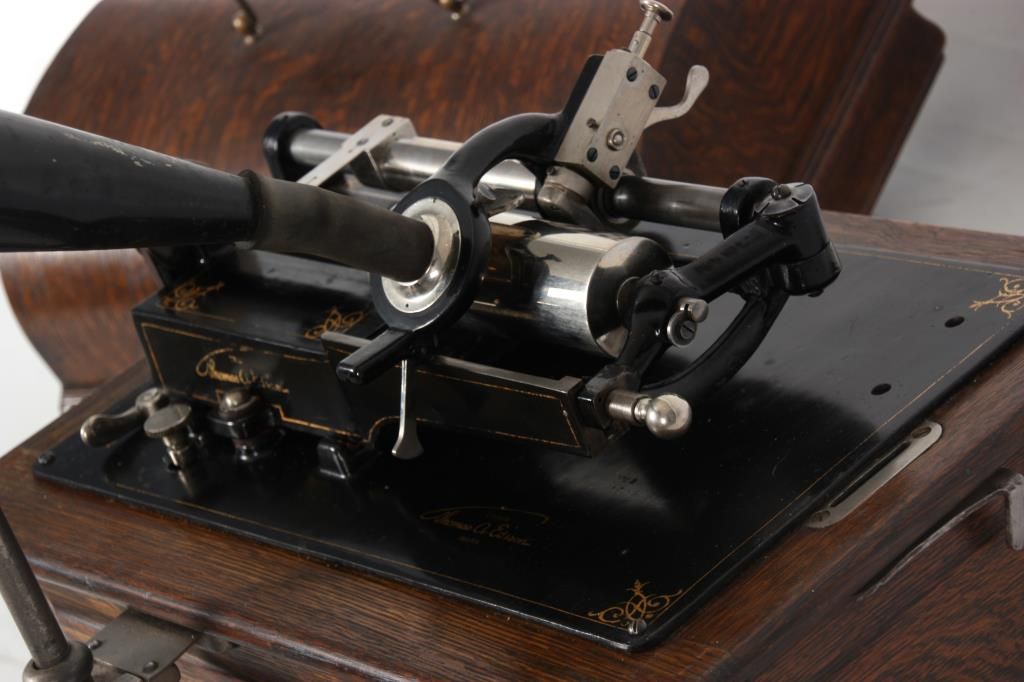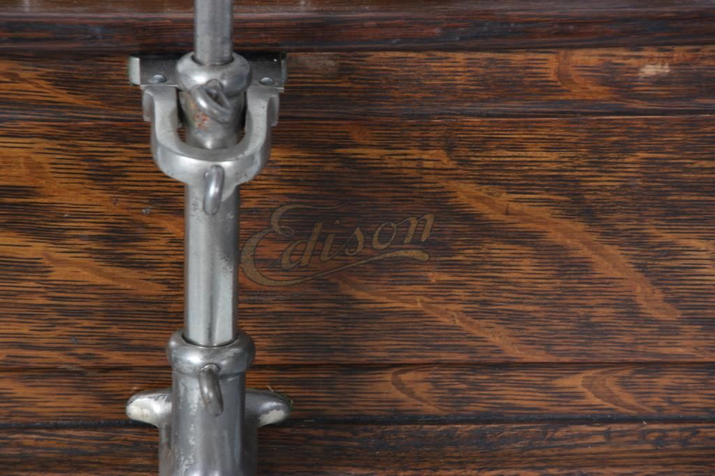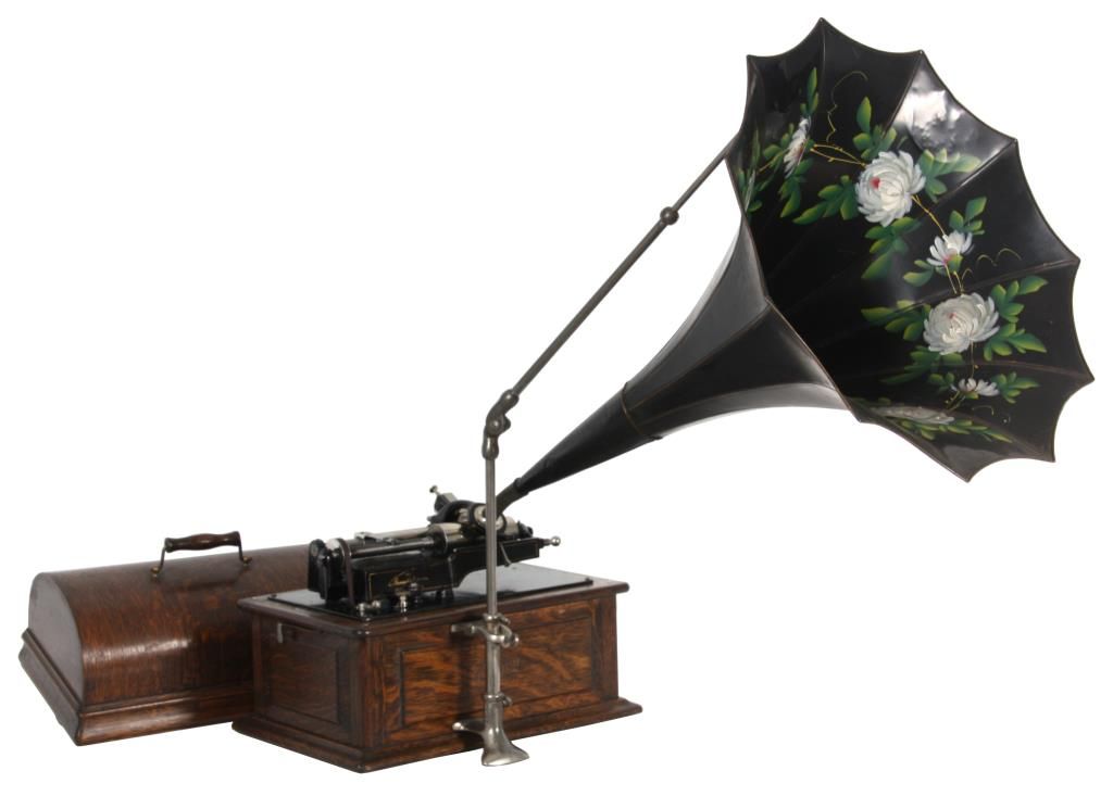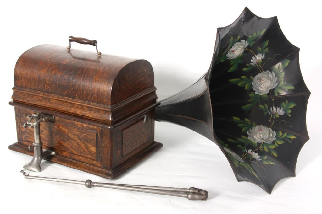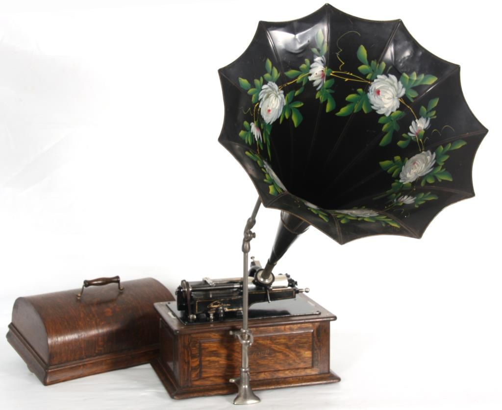 Edison Triumph Type-B Phonograph. Edison Triumph Type-B Cylinder Phonograph. Oak case has raised panels on the sides and domed cover; front mounted nickel plated crane with large black painted high point 11 panel chrysanthemum decorated horn with lobed rim, 30 in. long x 22 in. dia, has a black painted base plate and chassis with model-C reproducer and brass Thomas A. Edison signature tag with serial number 50353. Overall dimensions 39 in. high x 18 in. wide x 39 in. deep.