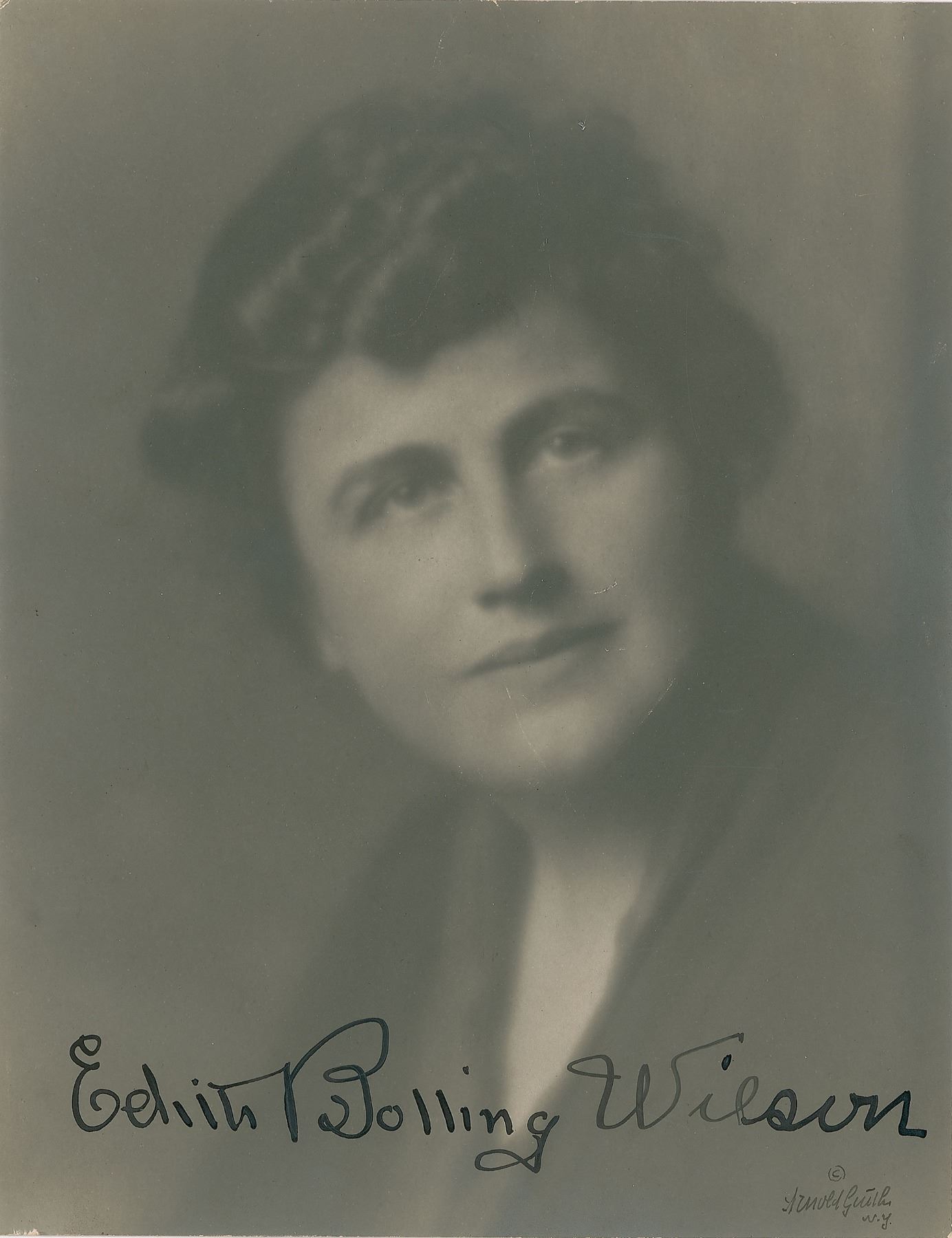 Superior vintage matte-finish 7.25 x 9.5 photo of Wilson by Arnold Genthe of New York, prominently signed in fountain pen, "Edith Bolling Wilson." Also signed in the lower right corner in ink by the renowned photographer, Arnold Genthe. In fine condition.