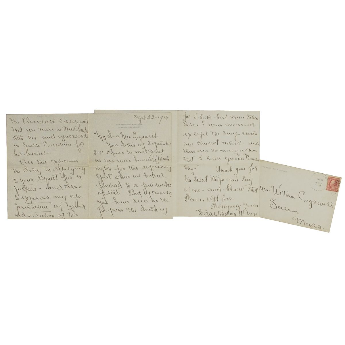 ALS, six pages on a pair of adjoining sheets, 5.25 x 6.75, The President’s Cottage, Elberon, New Jersey letterhead, September 22, 1916. The newly married first lady writes Mrs. William Cogswell of Salem, Massachusetts, about the death of President Wilson’s sister and a lack of photographs. In part: “You have seen in the process the death of the President’s sister, and that we were in New London with her and afterwords [sic] in South Carolina for her burial. All this explains the delay in replying to your request for a picture and also to express my appreciation of your admiration of Mr. Wilson. I need hardly say what an echo your…words find in my heart…Doesn’t it seem queer to find me interested in Politics? I remember how you always loved it and how well qualified you were to discuss all questions in regard to the profess of affairs…I am sorry that I have no photographs, for I have had none taken since I was married except the snapshots one cannot avoid—and there are so many of them that I have grown camera shy.” Central horizontal fold, light handling wear, and a bit of soiling, otherwise fine condition. Accompanied by the original mailing envelope.