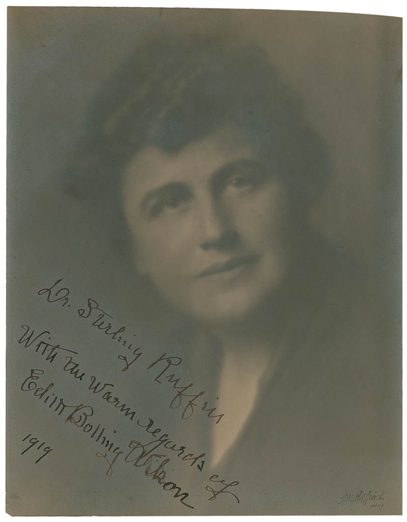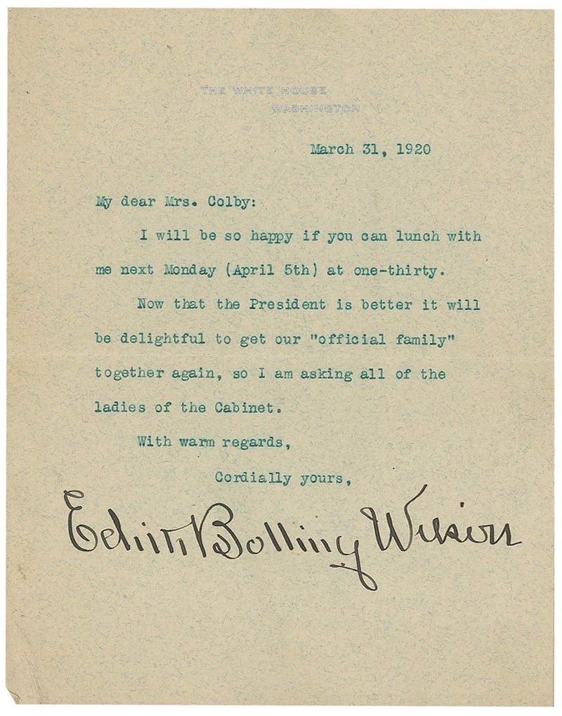 Scarce vintage 7.25 x 9.25 matte-finish photo, signed and inscribed in fountain pen, “Dr. Sterling Ruffin, with the warm regards of Edith Bolling Wilson 1919”; and a TLS, one page, 5.25 x 6.75, White House letterhead, March 31, 1920. Letter to Mrs. Colby, presumably the wife of Secretary of State Bainbridge Colby, extending a lunch invitation. In part: “Now that the President is better it will be delightful to get our ‘official family’ together again, so I am asking all of the ladies of the Cabinet.” Moderate silvering and trimmed edges to photo, as well as Wilson writing over her last name again, and some mild toning to letter, otherwise fine condition.